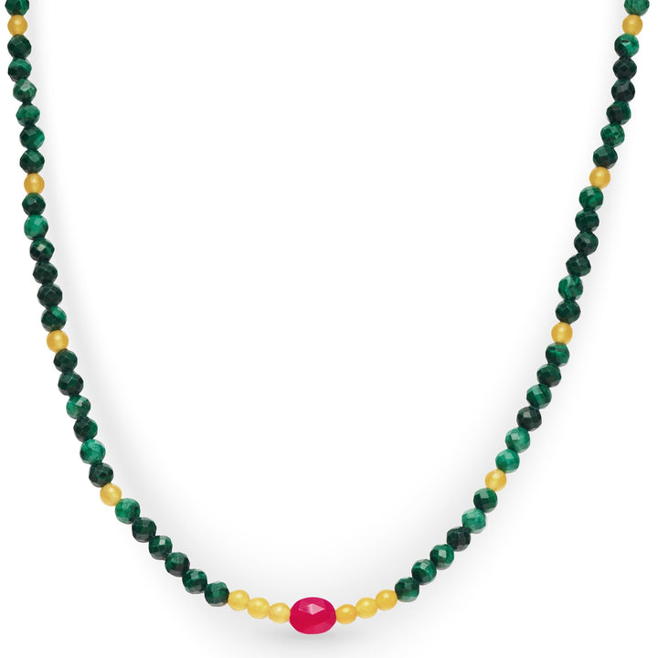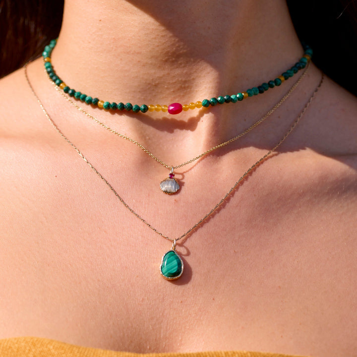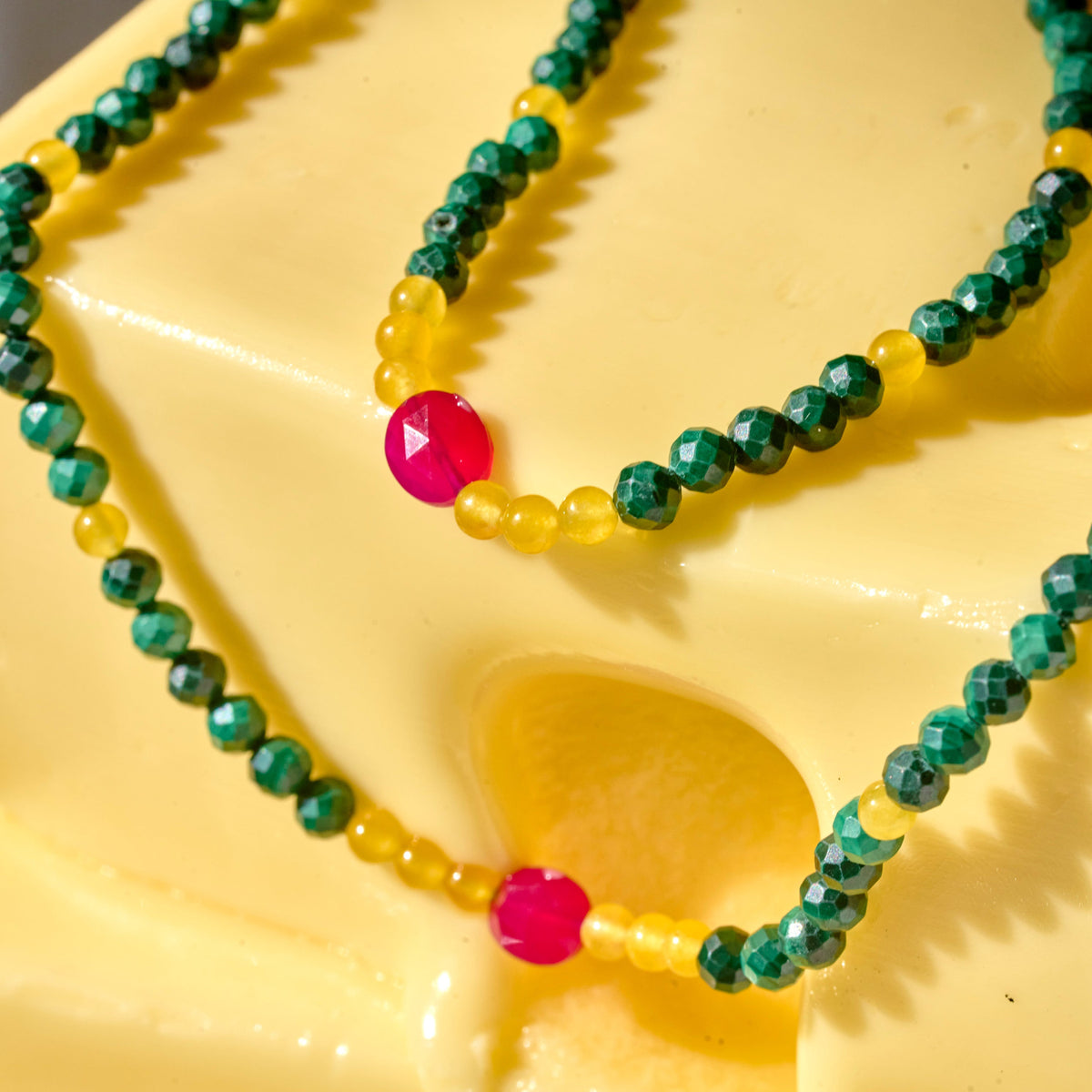 This necklace is made from recycled sterling silver and features pink quartz, citrine, and malachite beads.