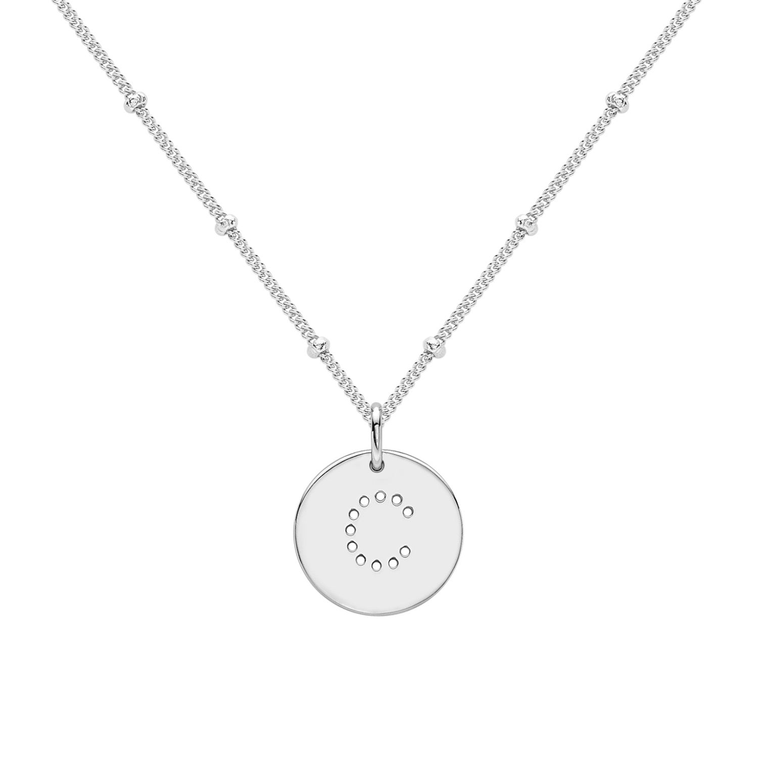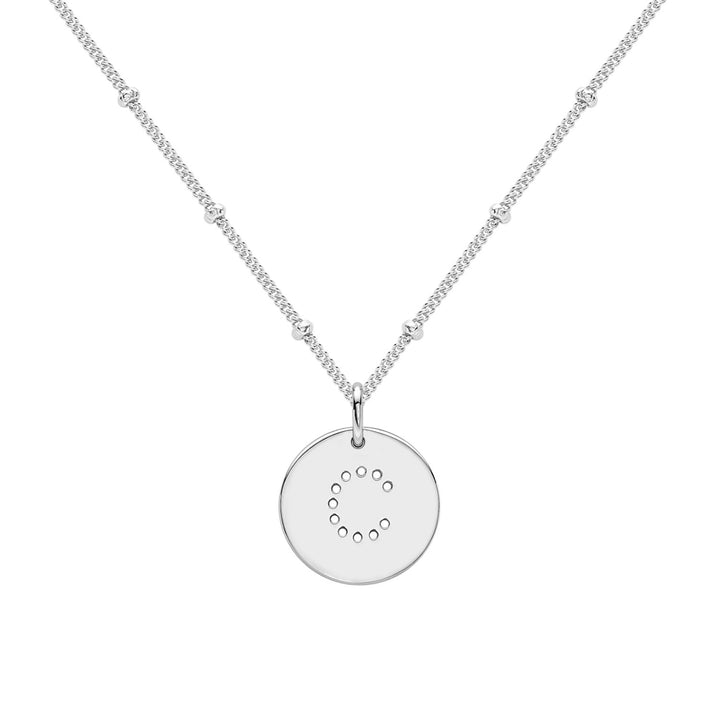 This lovely pendant necklace is the perfect personalised gift. The necklace features a round disc with an initial cut-out design. The necklace is set in Sterling Silver. The item is sold as a set, consisting of a disk pendant and a bobble chain necklace. This letter necklace sits just below your collarbone, and the length can be adjusted. The necklace features a lobster clasp and three extension hoops. This jewelry piece is ideal for gifting and everyday wear.