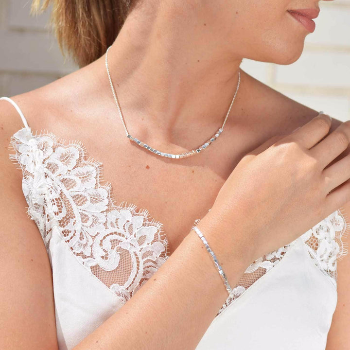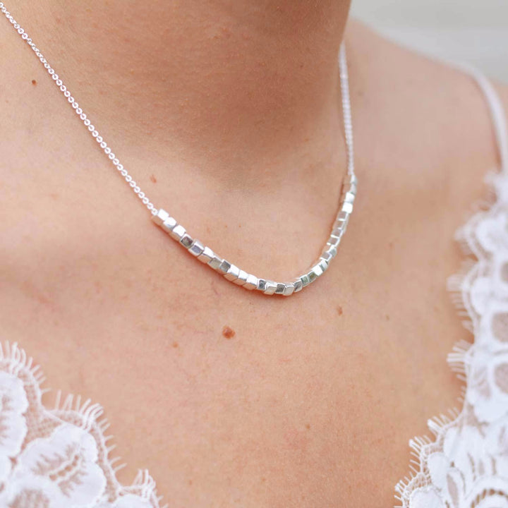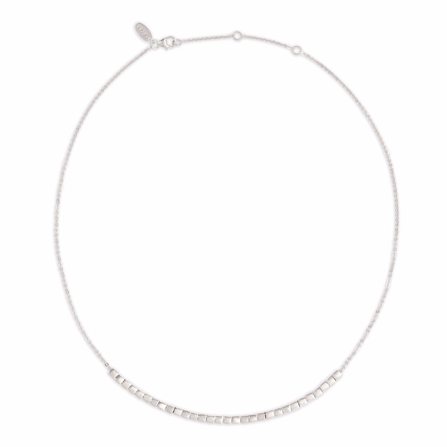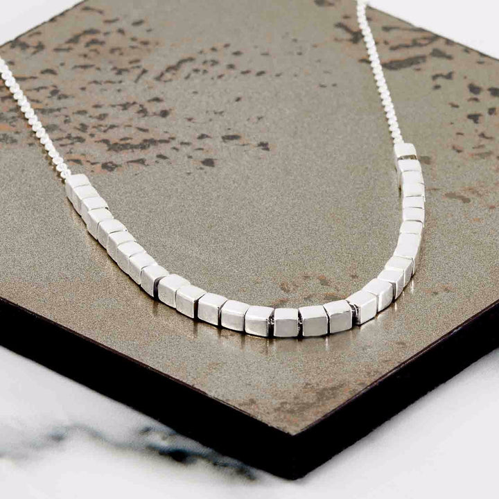 This geometric necklace has a distinctive contemporary design. The main feature is a series of individual cubes. The cubes are moveable and give the necklace a tactile fluid feel. Inspired by the Cubism art movement this necklace will elevate your everyday style from morning til dawn. The necklace is set in solid Sterling Silver and features 30 cubes with a lovely polished finish. The length of the necklace can be adjusted with three hoops, ensuring the perfect fit on the neckline.