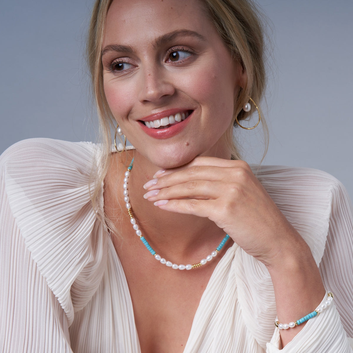 A fun and fabulous cultured freshwater pearl necklace with gorgeous turquoise to give that all important pop of colour! An essential addition to your summer wardrobe - perfect for daywear on the beach as well as sunset dining in exotic locations.