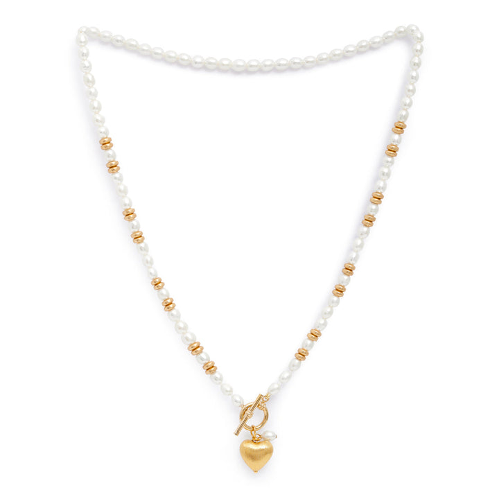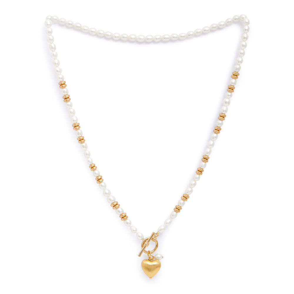 Cultured freshwater pearl necklace with gold hematite beads on a gold plated toggle clasp with gold vermeil heart charm