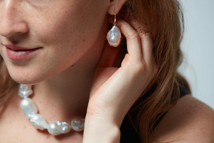 An out of this world large baroque cultured freshwater pearl necklace. These large arresting organic shaped pearls are a definite showstopper. Each pearl will have taken years to form and have their own stories to tell.