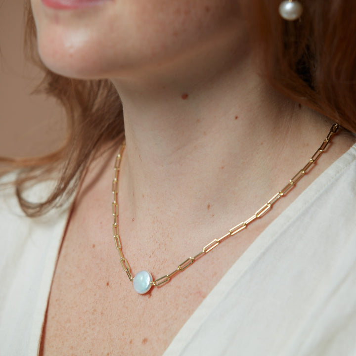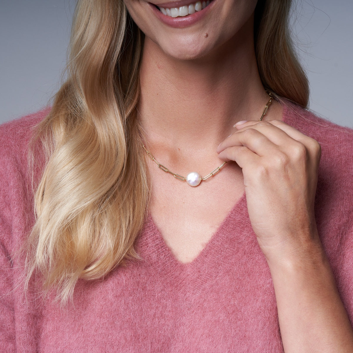 A stunning necklace combining the timeless pearl with modern design. A lustrous cultured freshwater coin pearl sits in the centre of stylish gold plated sterling silver link chain. Coin pearls are not only beautiful but also regarded as lucky! A must for your jewelry collection.