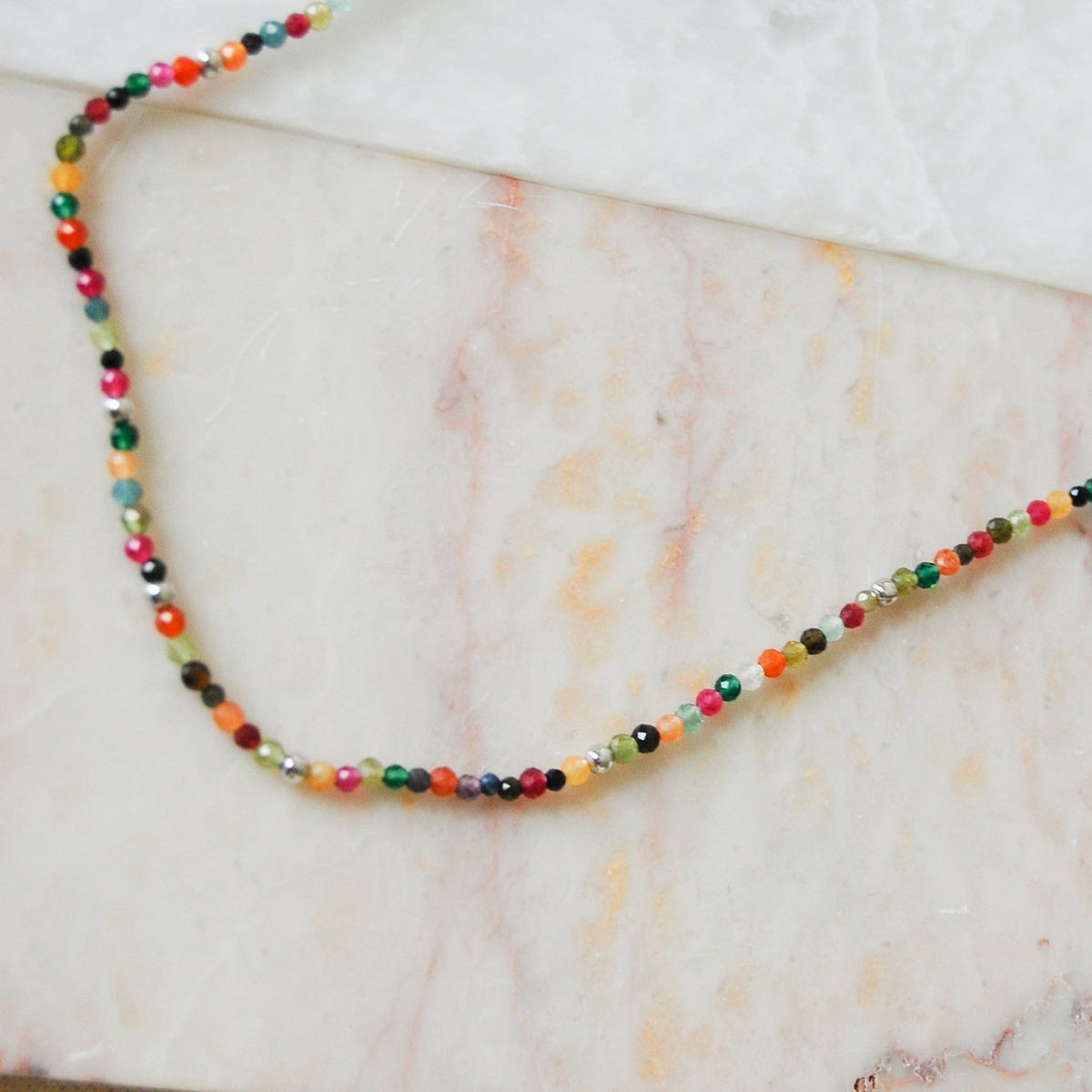 This beaded necklace is made from solid sterling silver and features semi-precious stones, including pink and orange quartz, watermelon tourmaline, and orange carnelian.