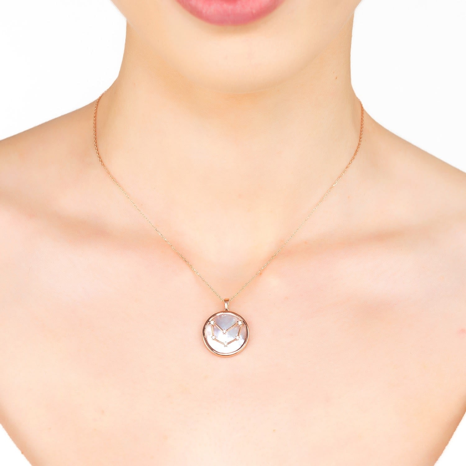 This necklace is made with 925 sterling silver dipped in 22ct rose gold. It features a disc of white mother of pearl and is handset with white cubic zirconia. The pendant is a Capricorn star sign constellation.