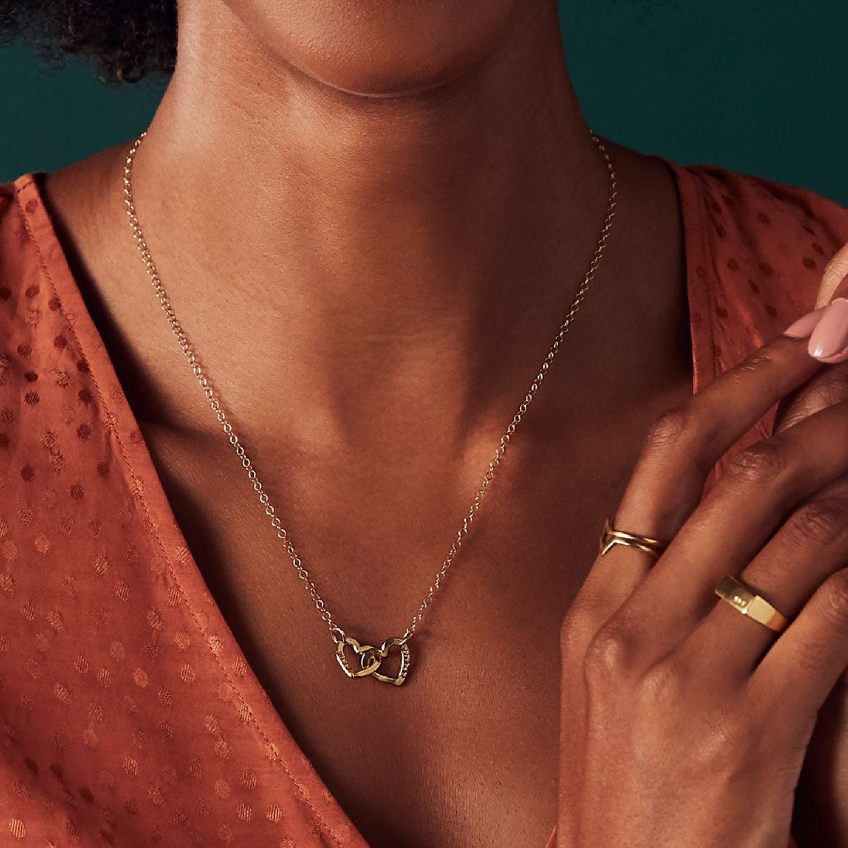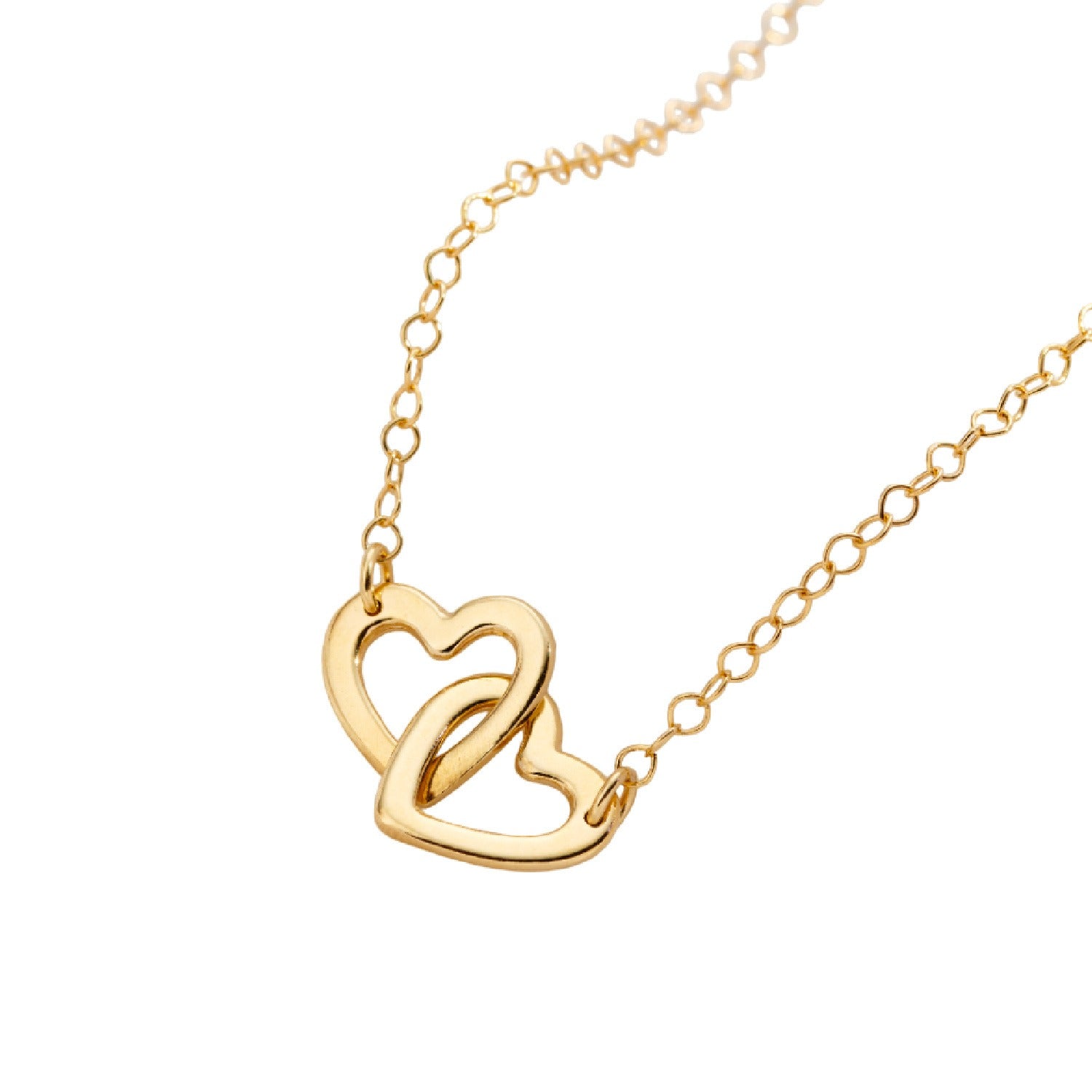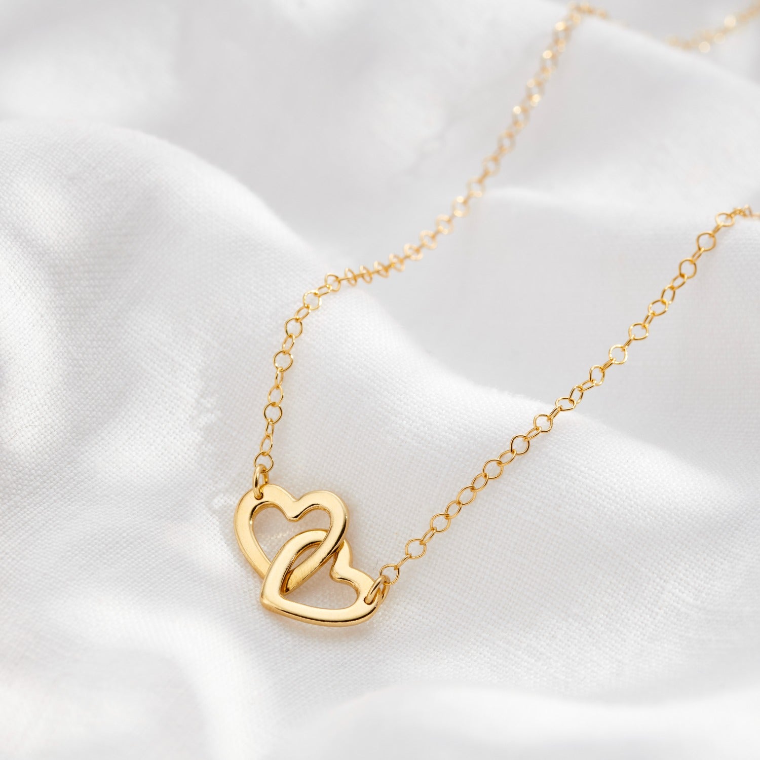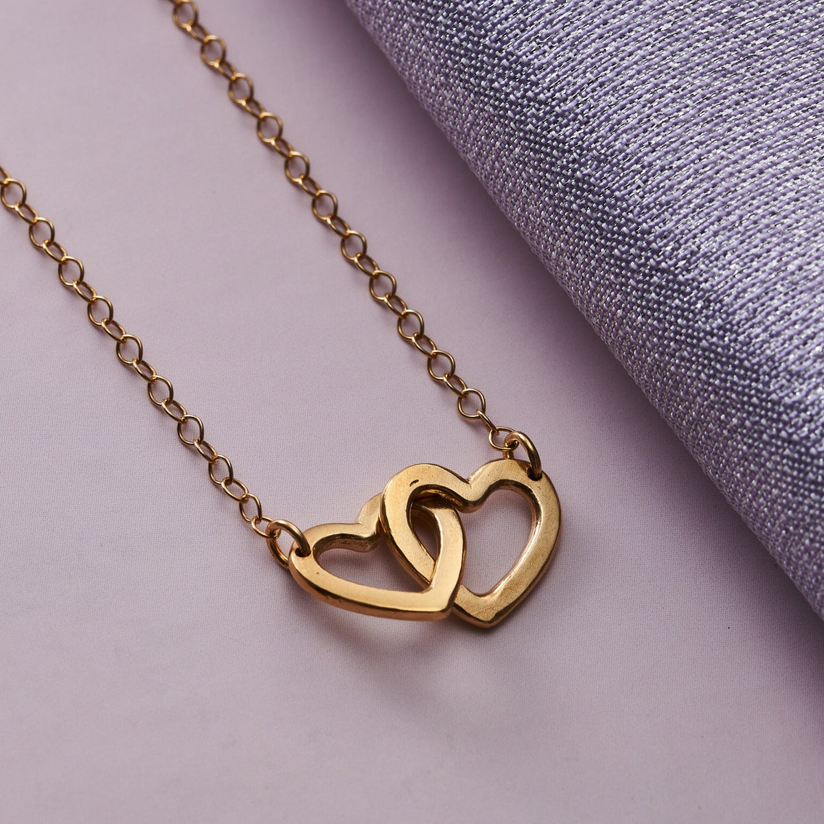 A beautiful new design fresh from the jeweller's workbench, this 18ct Yellow Gold Plated Double Heart Necklace is inspired by our bestselling Double Hoop collection. Featuring two sleek interlinking heart pendants suspended from a fine trace chain. Each bespoke Double Heart Names Necklace is individually handmade from sterling silver then plated in 18ct yellow gold plating. A lovely gift for birthdays, anniversaries, Mother's Day or for a bride on her wedding day.