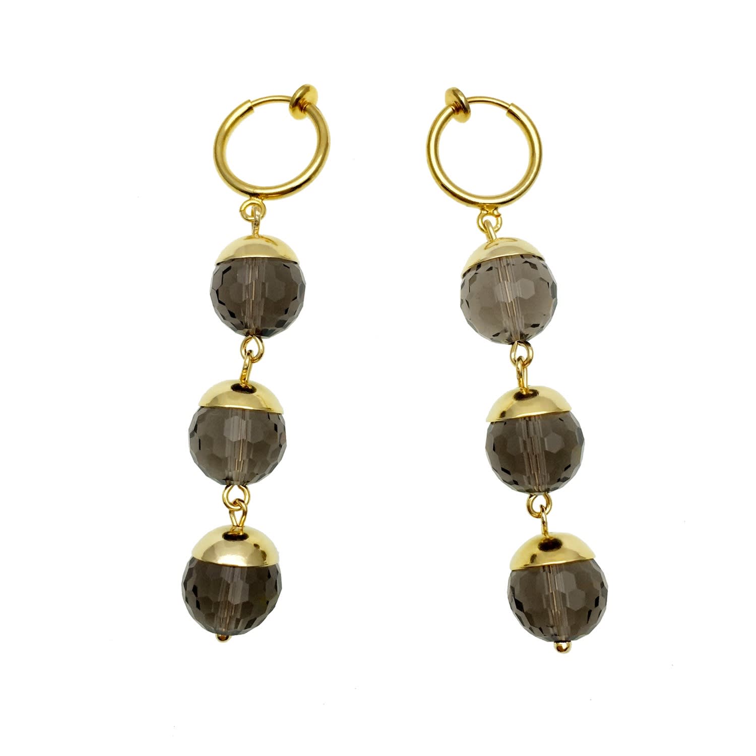 These clip-on earrings are made from smoky quartz with golden-plated brass findings.