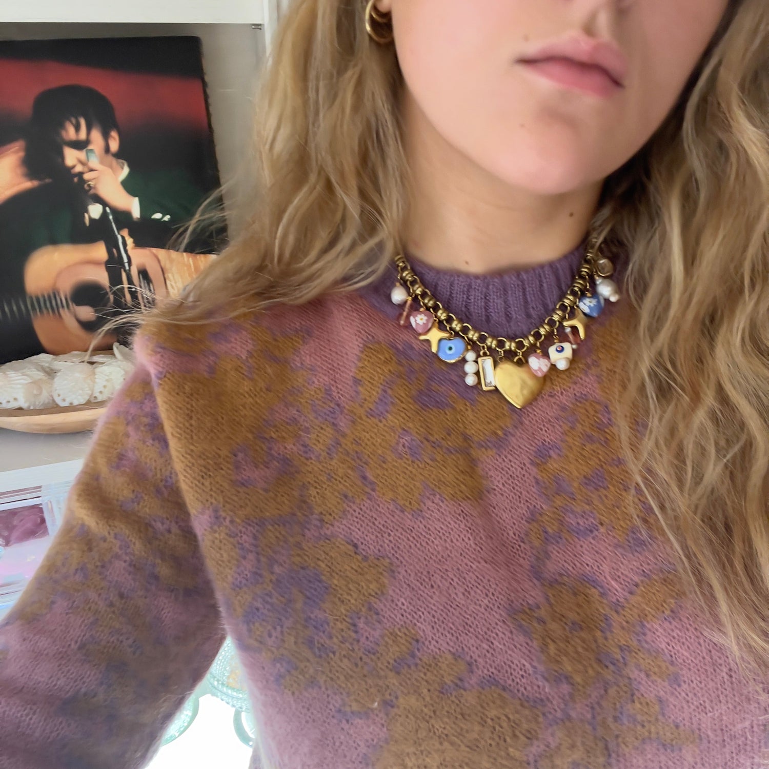 Delicate shades of pink and blue all wrapped up on a unique multi-ring chain. 17" 12k antiqued gold plated brass multi-ring chain featuring a wide array of pink, blue, freshwater pearl and gold hand wire wrapped charms from all over the world. It also includes a mini 12k antiqued gold plated pewter toggle clasp for easy on and off.