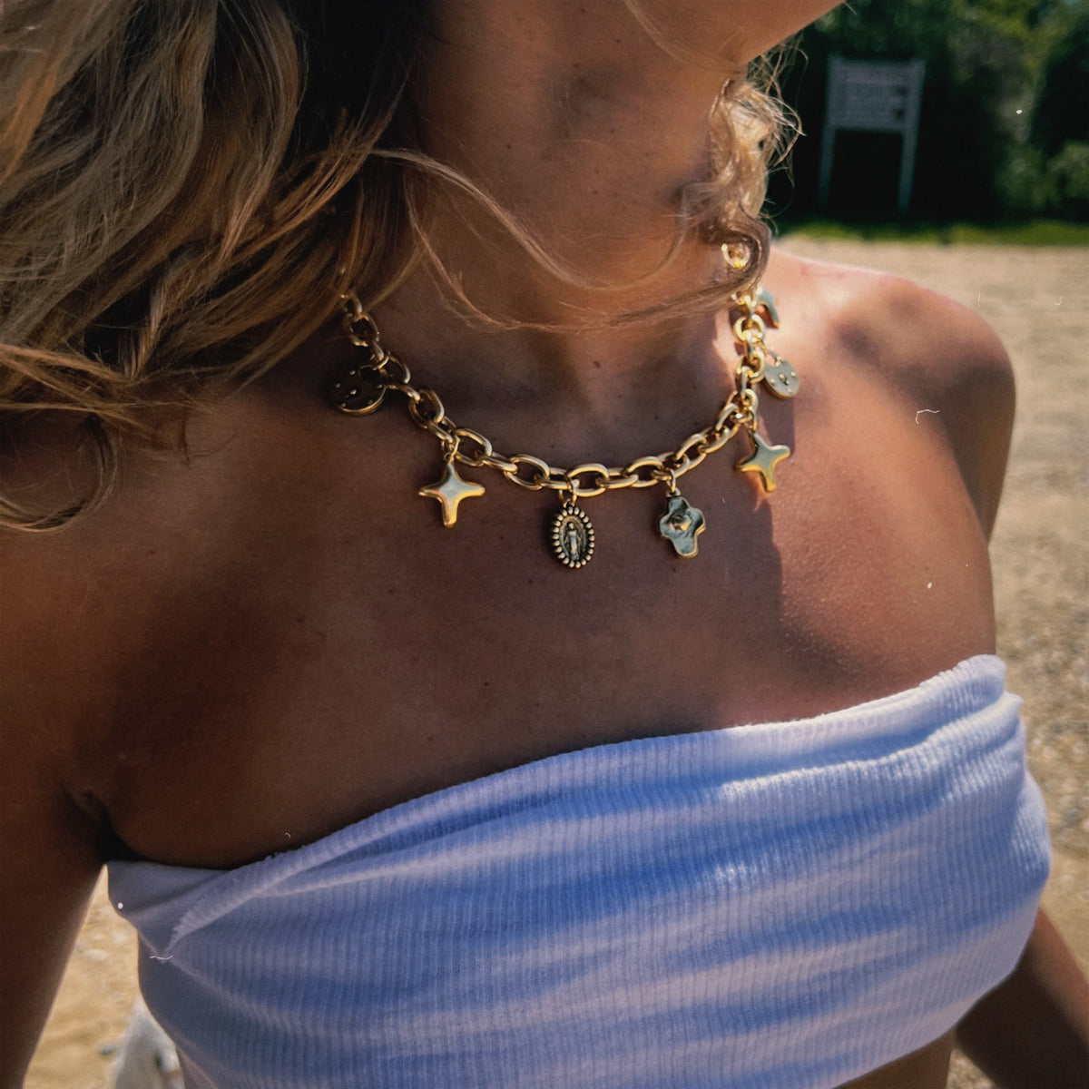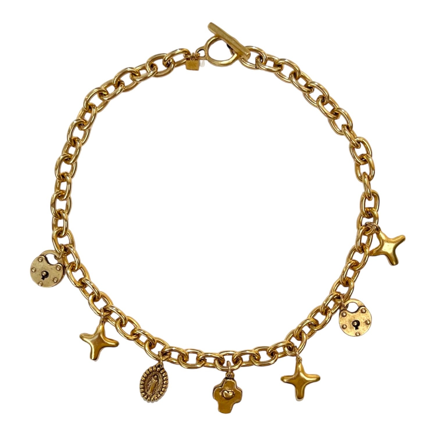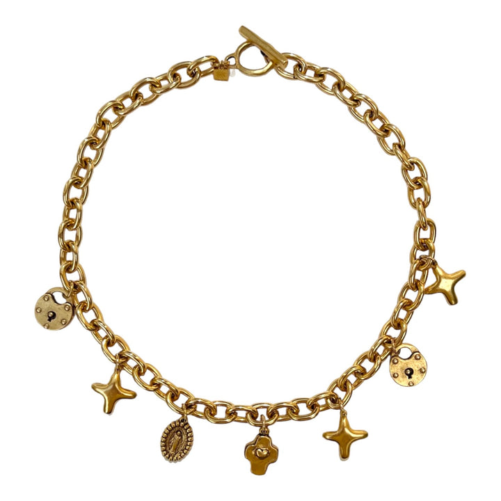 A twist on a classic charm necklace! 18” luxe chunky 12k antiqued gold plated stainless steel chain fitted with a wide array of hand-crafted 12k antiqued gold plated pewter charms, and a mini 12k antiqued gold plated pewter toggle clasp. Dresses up a white t-shirt and jeans.