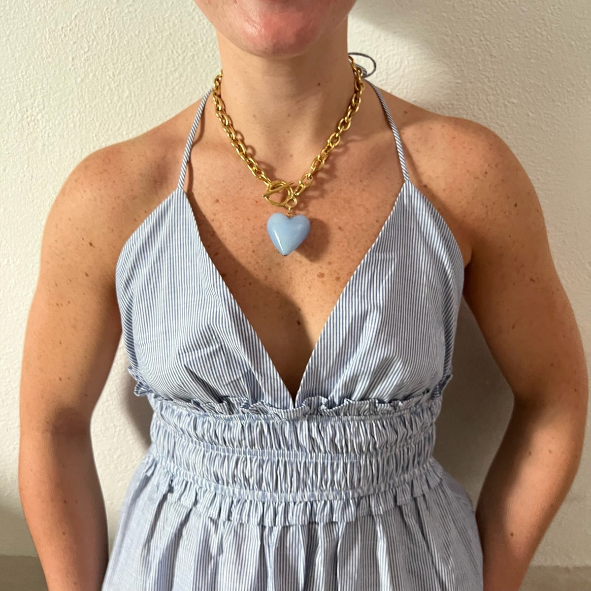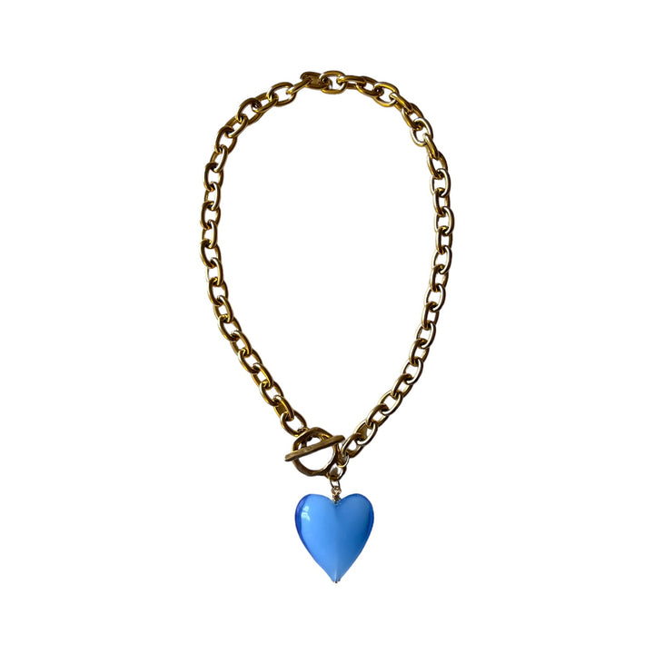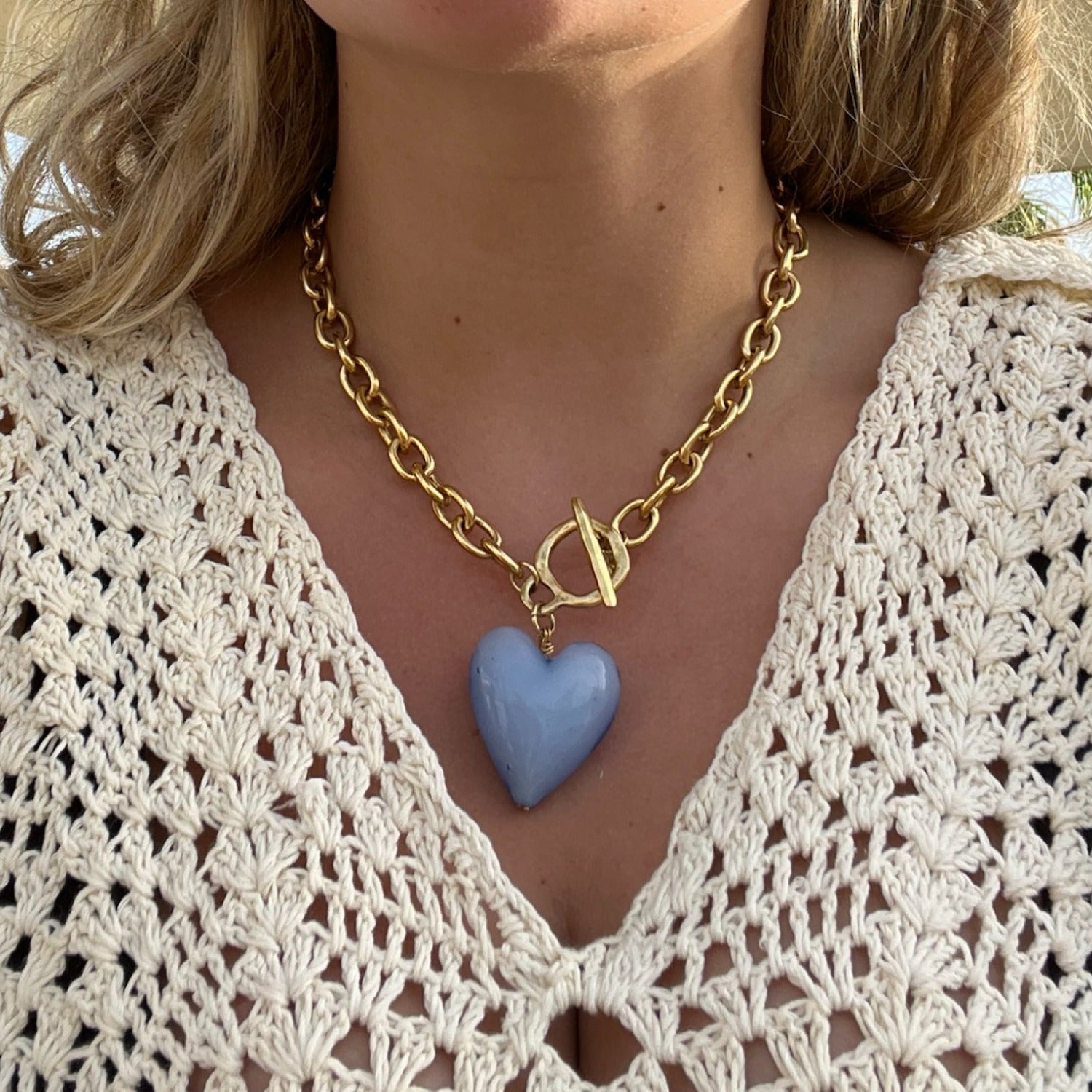 Inspired by an Italian summer, the amore necklace is a 17.5” design. Elevated with a chunky 12k antiqued gold plated stainless steel chain, large 12k antiqued gold plated pewter toggle clasp, and a statement Murano glass blown heart pendant imported from Italy <3. Comes in a variety of delicious colors!