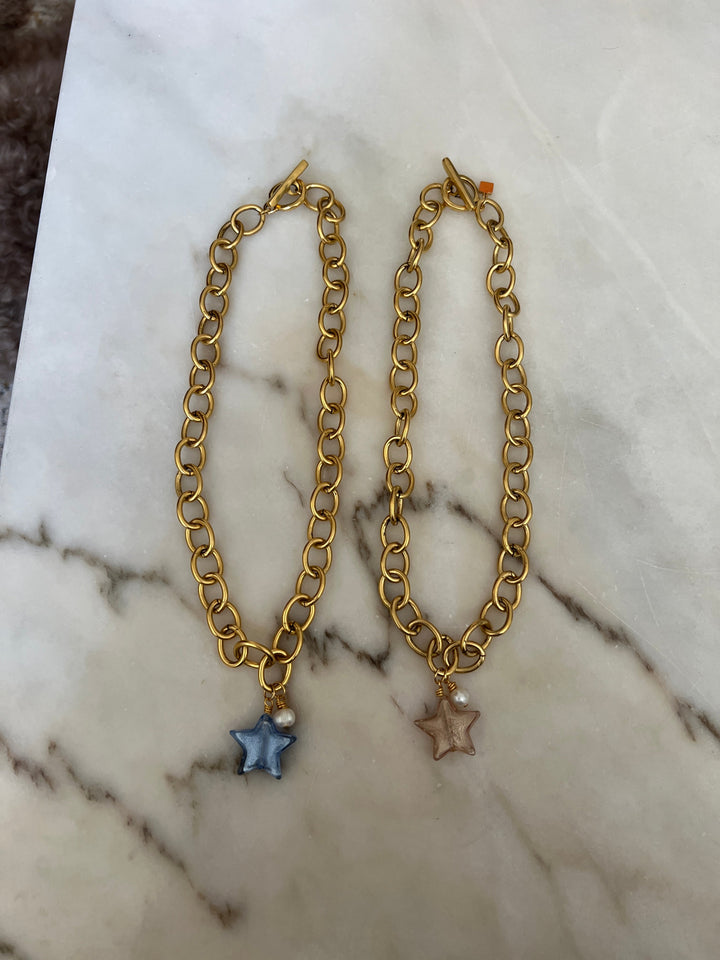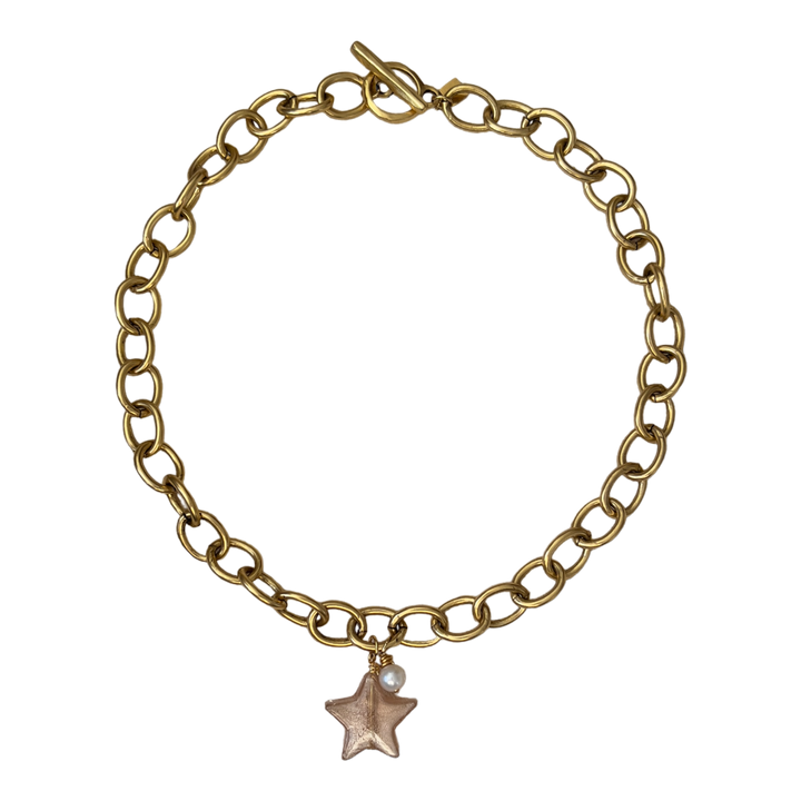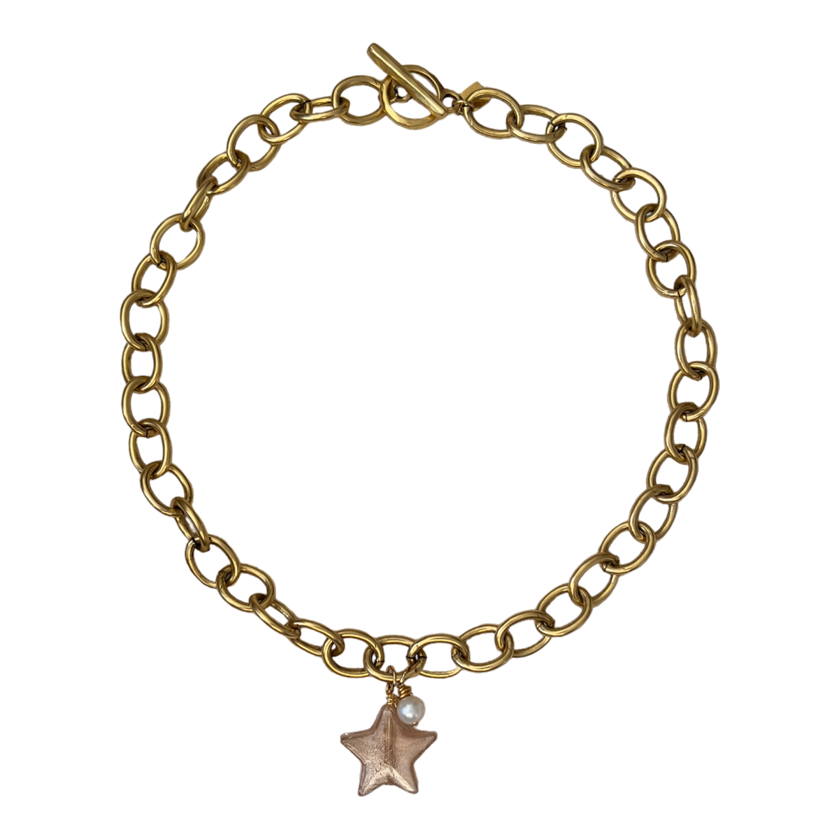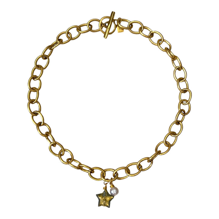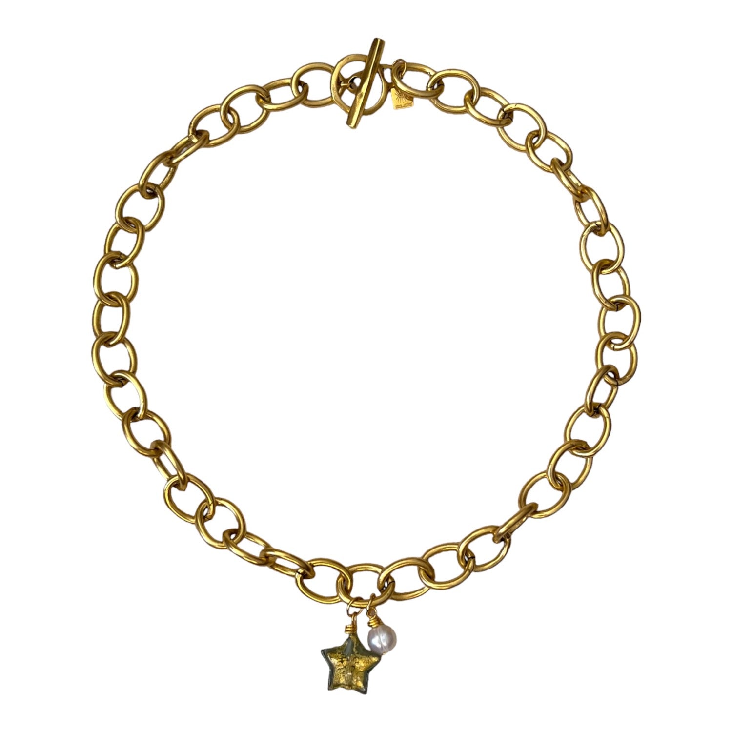 18' chunky 12k antiqued gold plated stainless steel chain featuring a green Murano glass blown wire wrapped star and freshwater pearl detail. It also includes a mini 12k antiqued gold plated pewter toggle clasp, for easy on and off. It's the perfect match for your Lille earrings or bracelet!