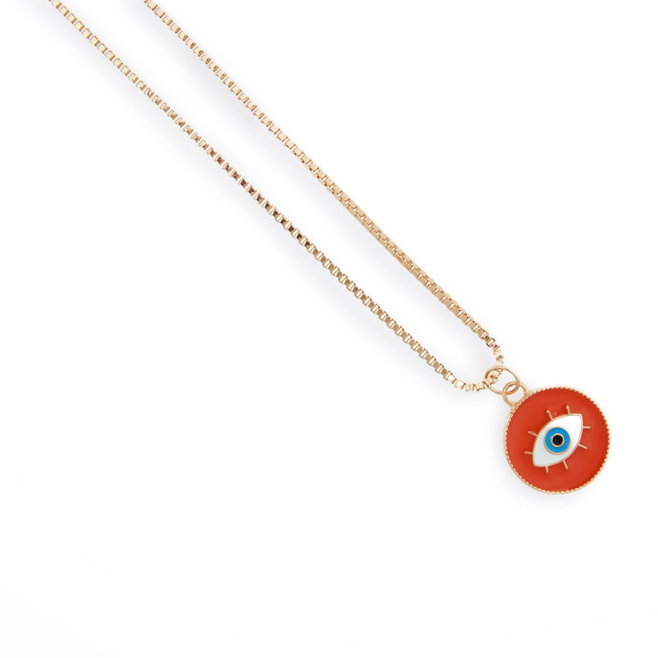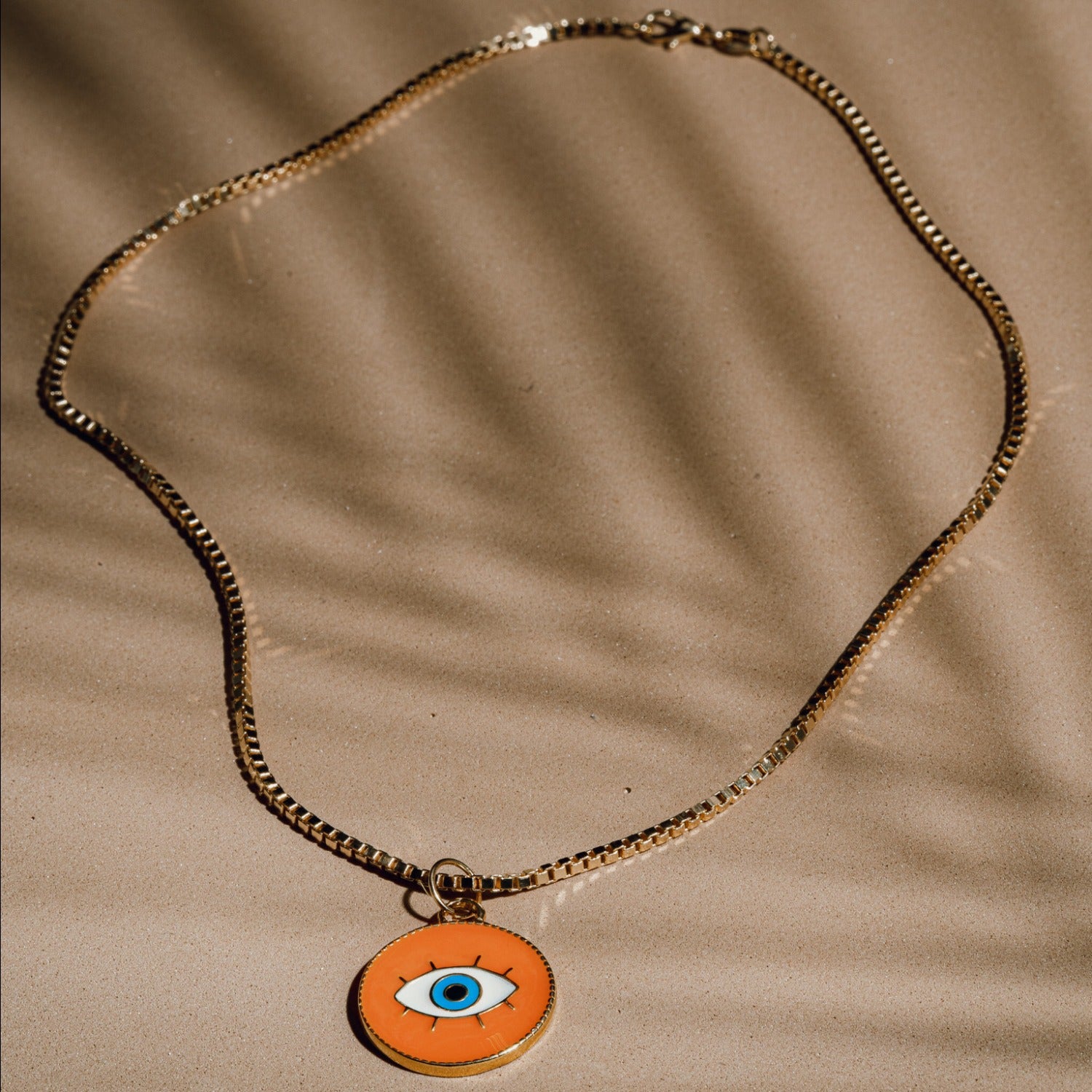 18K Gold filled necklace, orange evil eye charm | 42cm length. We present your newest lucky necklace! Comfortable to wear and super charming, get this accessory for yourself as a gift to keep you always in the mood to reach the top of the world! Please avoid any contact with perfumes and cosmetics