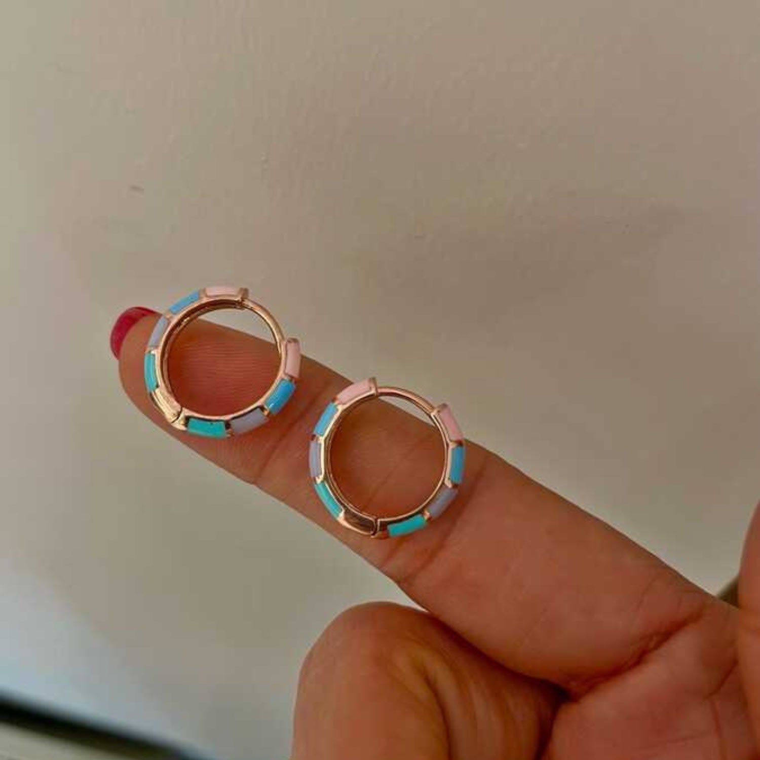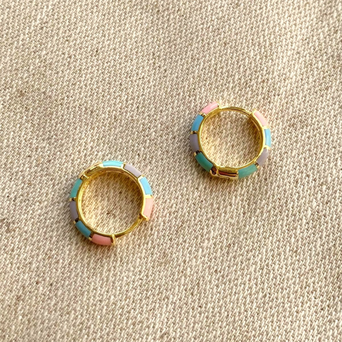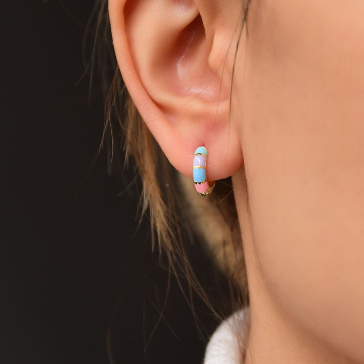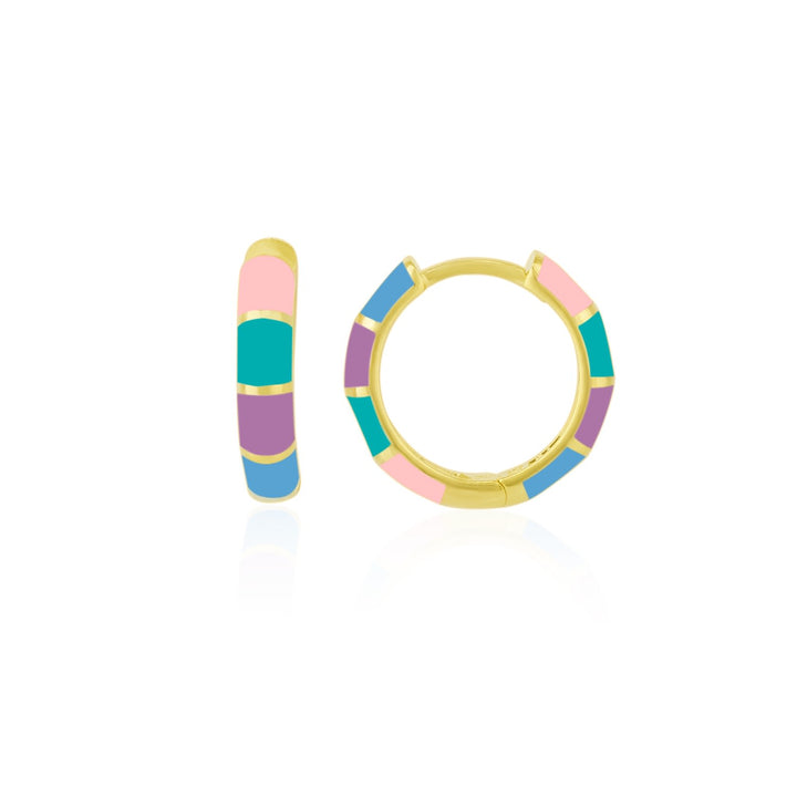 925 recycled sterling silver with rainbow enamel inlay, gold-tone finish, hinged-back closure, mini hoop design.