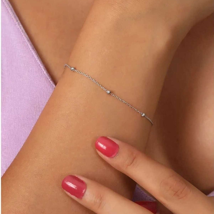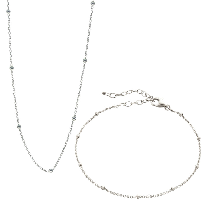 'Upgrade your jewelry game with this fun and versatile Bead Chain Sterling Silver Satellite Necklace and Bracelet Set! Perfect for adding a stylish touch to any outfit, the unique bead chain design will have you standing out from the crowd. No need to choose between a necklace or bracelet - you get both with this set!'