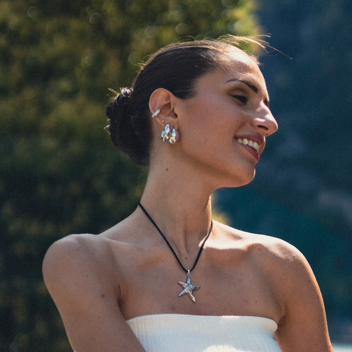 This Starfish Choker Steel by Glasstyk is a symbolic and resilient accessory inspired by the ocean. The necklace features a starfish charm and is made with a water-resistant, PVD-coated finish, allowing it to be worn in the shower and at the beach. Its design is an invitation to carry the serenity of the shoreline with you, wherever you go.
