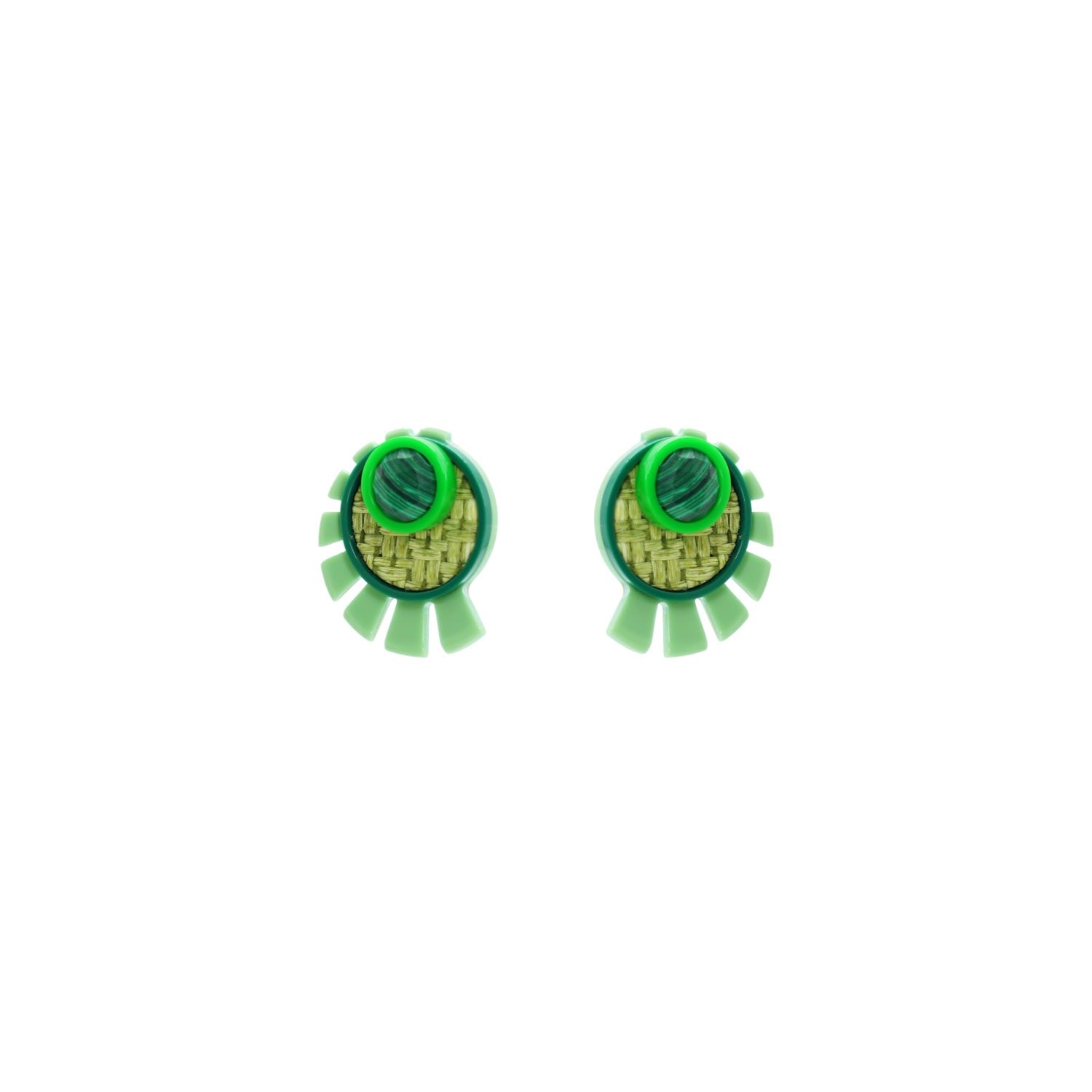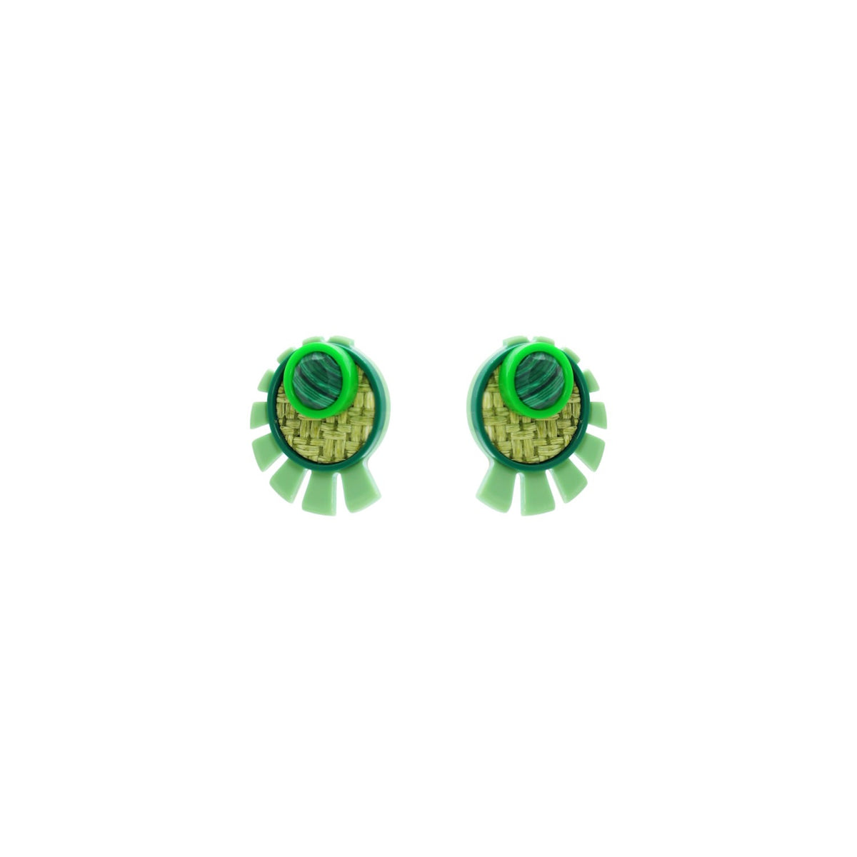 These earrings are made from acrylic, glass stone, and raffia straw. They feature a stainless steel pin and are handmade by Brazilian artisans.