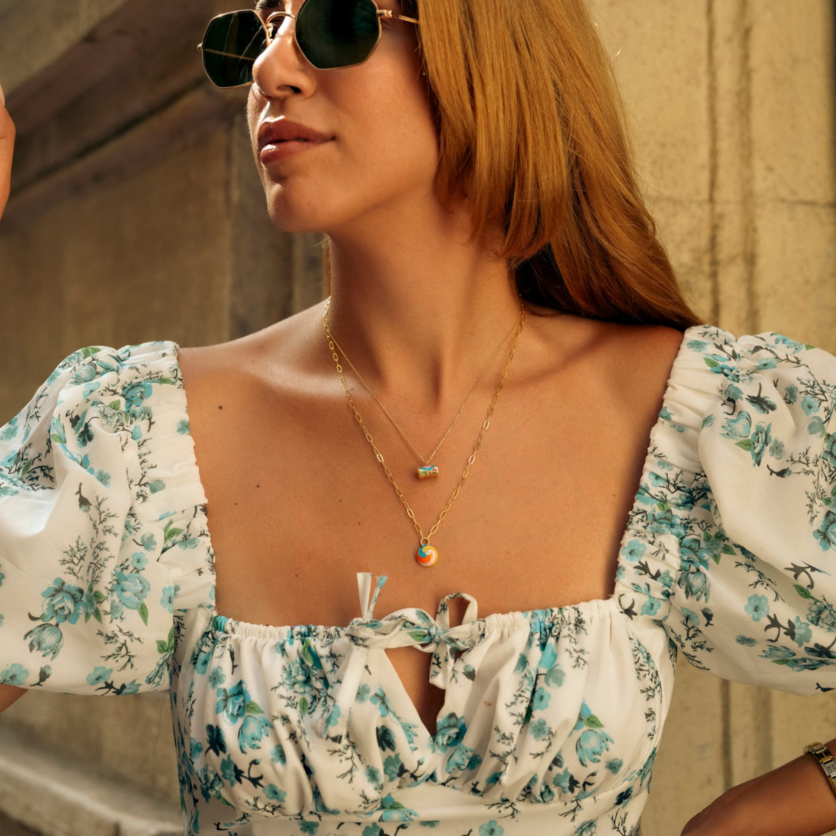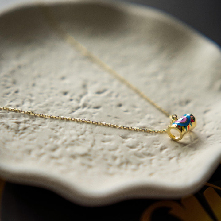 This necklace is crafted from 100% fine sterling silver and features a pendant with an enamel design.