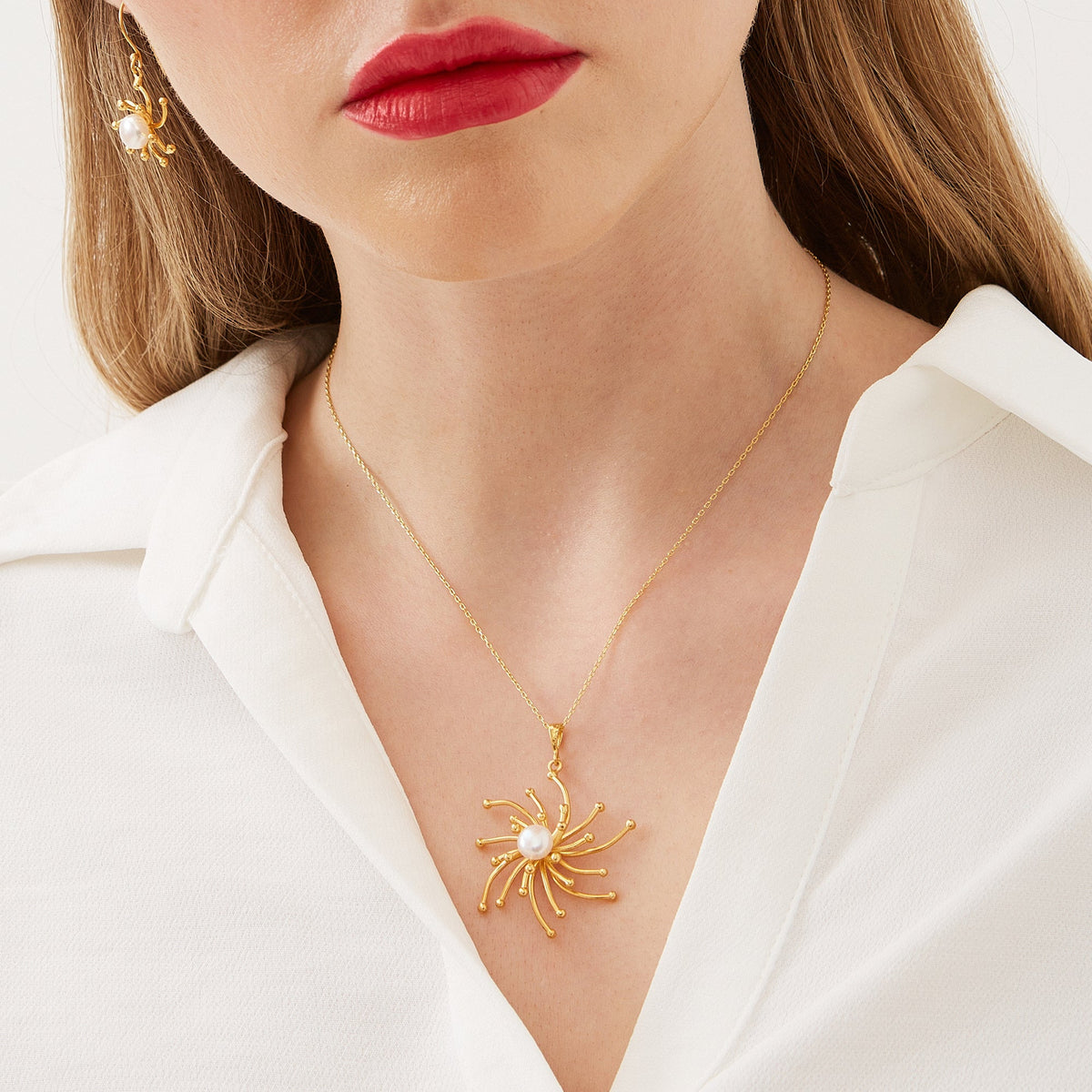 Pearl Sun Molten Dripping Sunburst Sterling Silver Pendant Necklace Gold