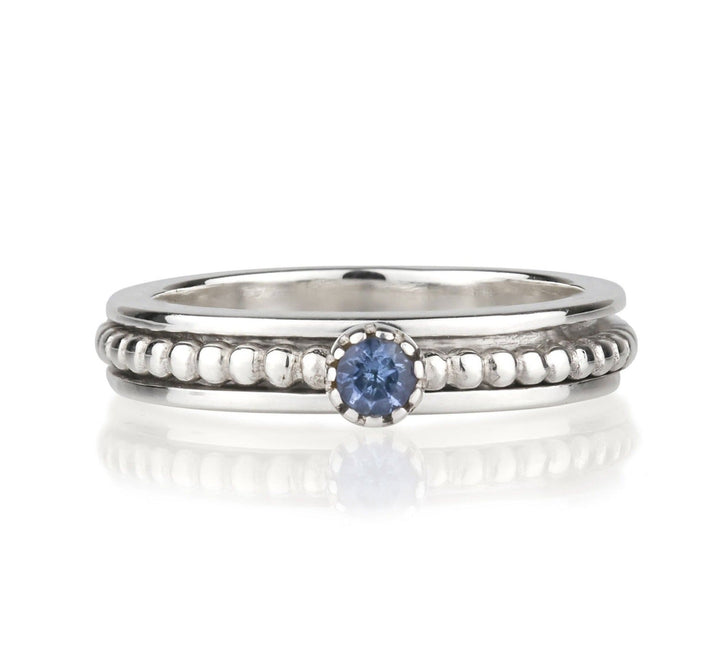 This ring is made from recycled sterling silver and features a 3mm faceted Tanzanite. It is also available in gold vermeil with cubic zirconia.