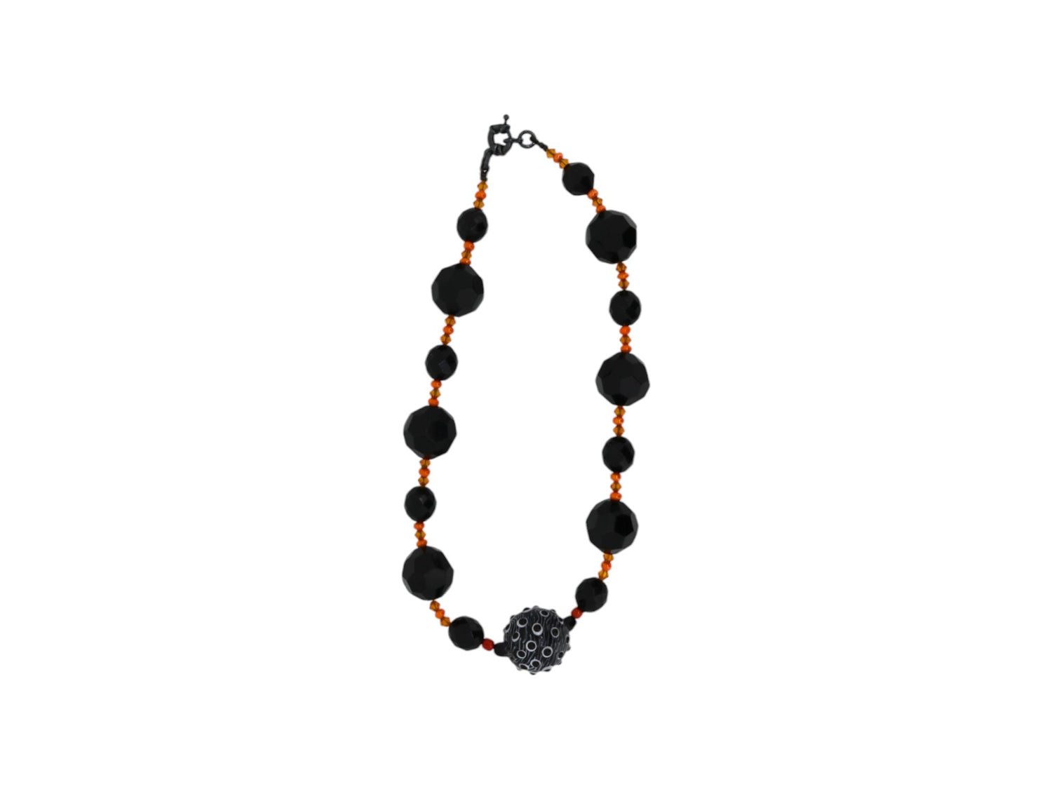 This Pumpkin Parade Necklace by Vickisarge is a one-of-a-kind, handcrafted accessory perfect for the spooky season. It contains vintage beads and premium Austrian crystals from the vaults, all held by an Oxidised Sterling Silver plated clasp. This unique necklace is bound to add a touch of playful sparkle to your party outfit, making it a perfect accessory for celebrating in style.