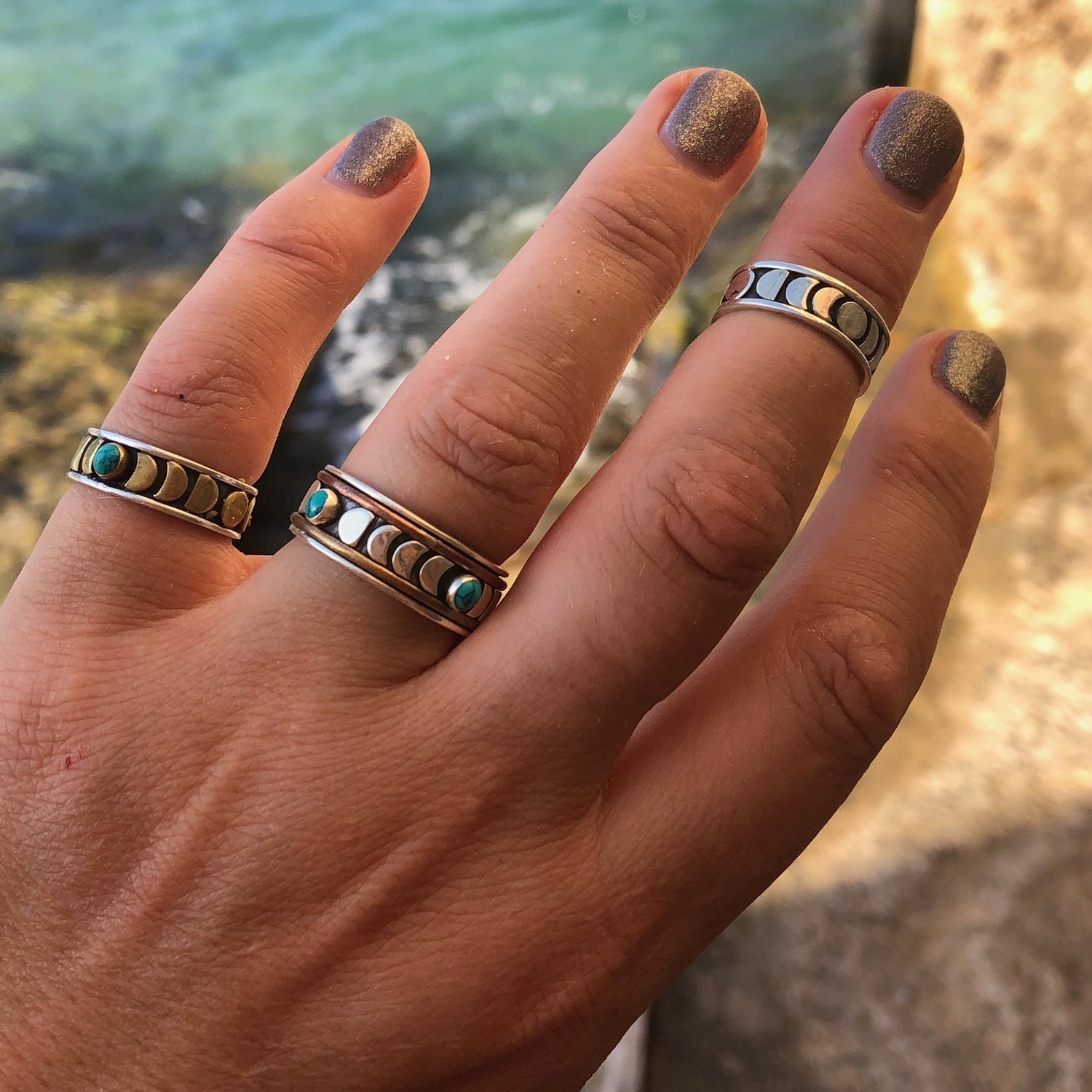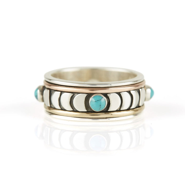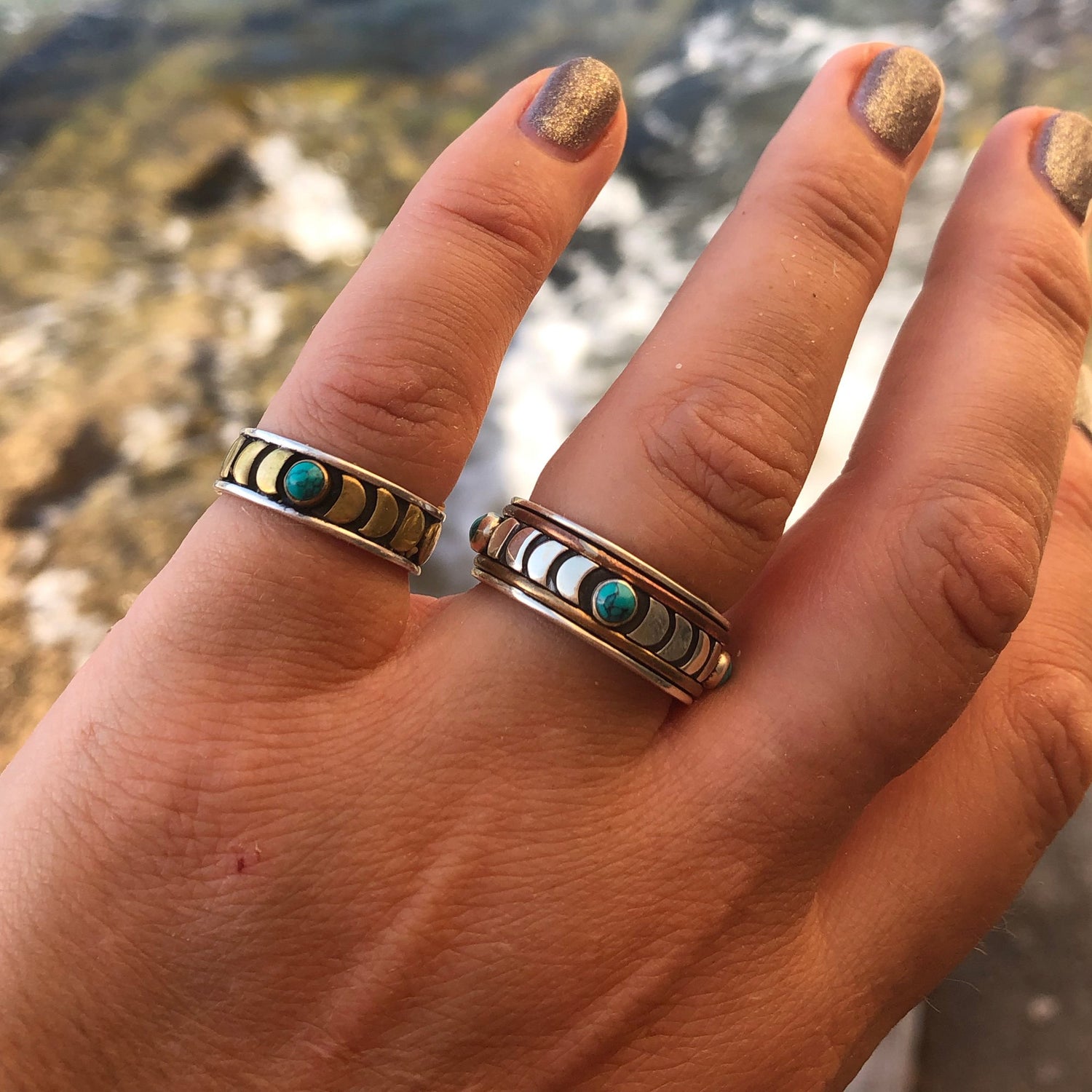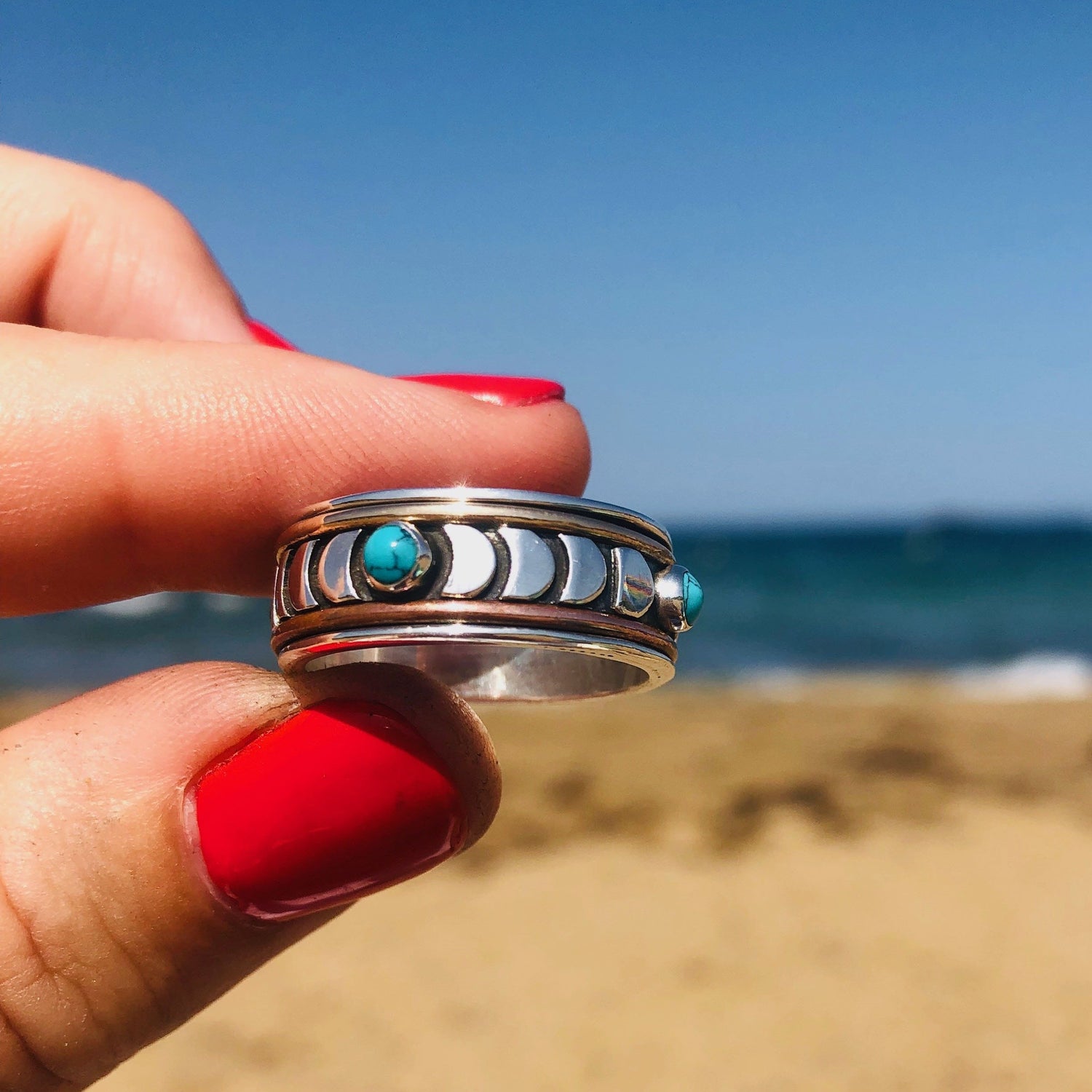 This Moon Phase Silver Spinning Ring with Turquoise by Charlotte’s Web Jewellery is inspired by the lunar cycle, symbolizing transformation and serenity. The soothing turquoise inlays and gentle spinning bands make it both a meditative accessory and a striking statement of celestial beauty.