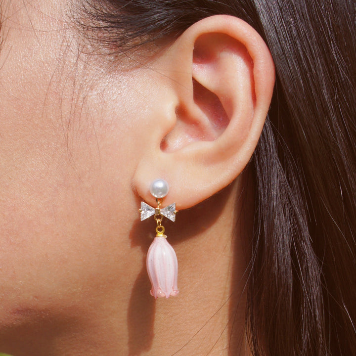 Real Flower Lilian Lily Of The Valley Crystal Bow Flower Drop Pearl Earrings - Pale Pink