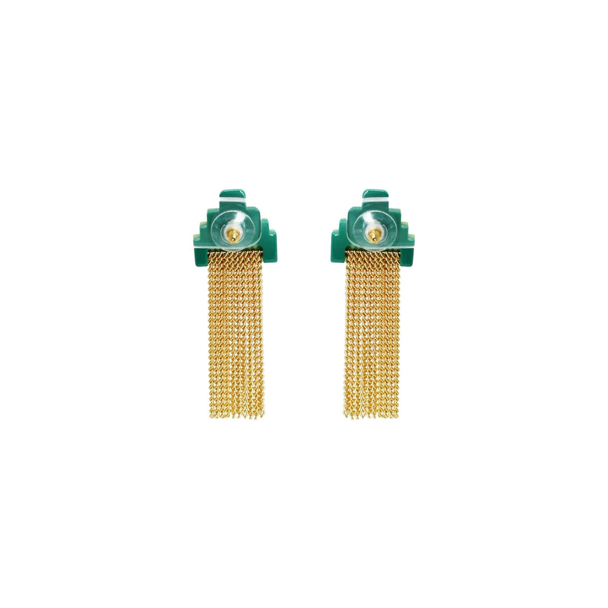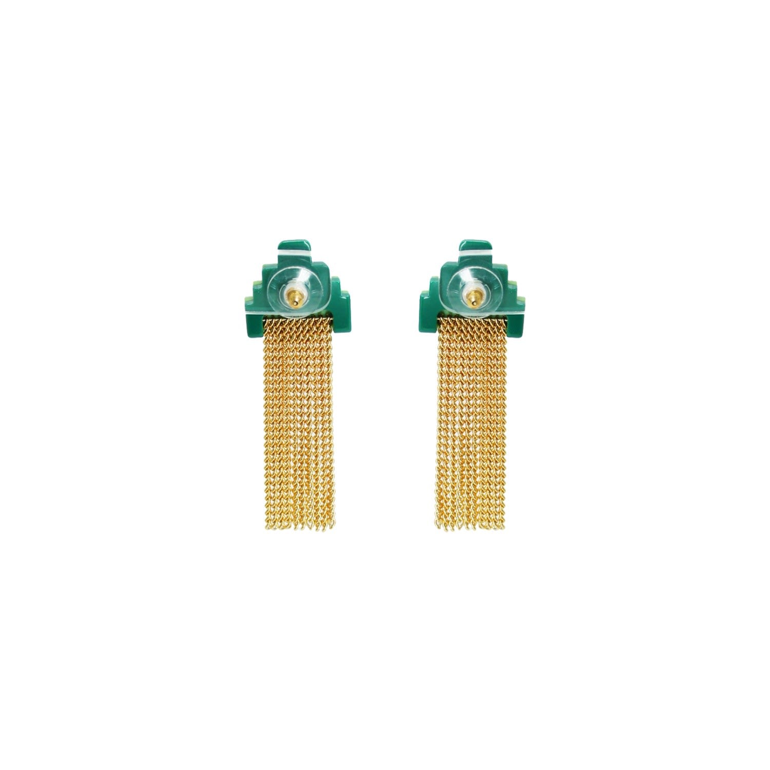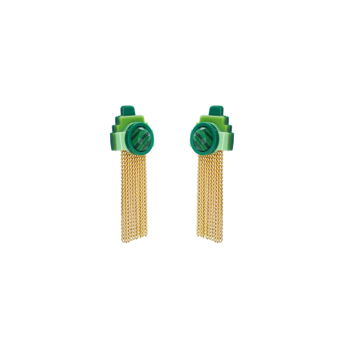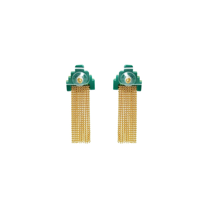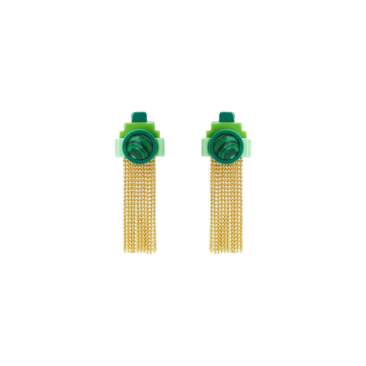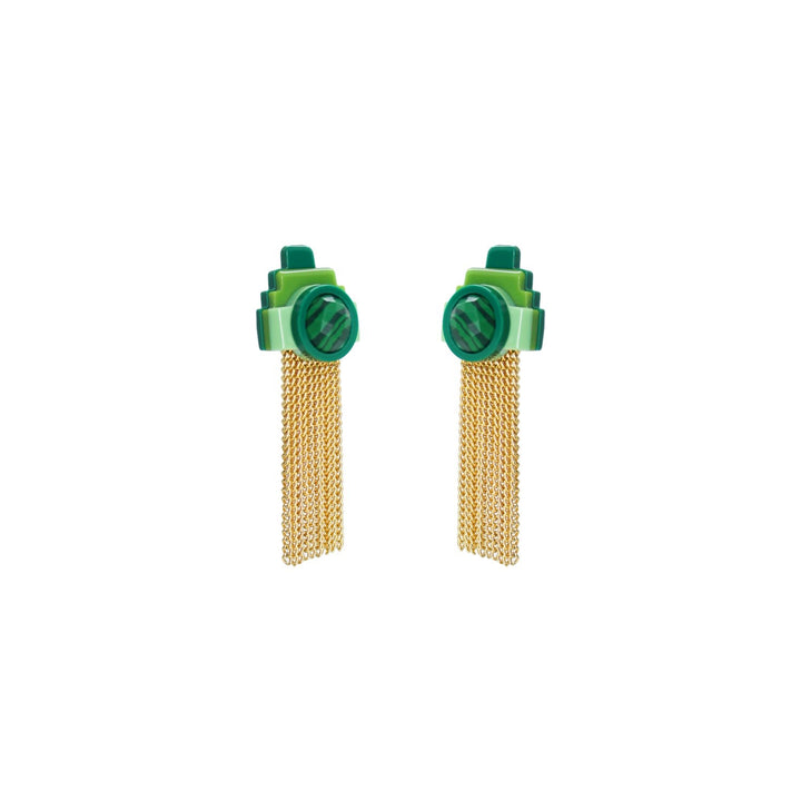 Handcrafted in Brazil, these earrings are made with acrylic, a glass stone, golden-finished brass chain fringe, and a stainless steel pin.