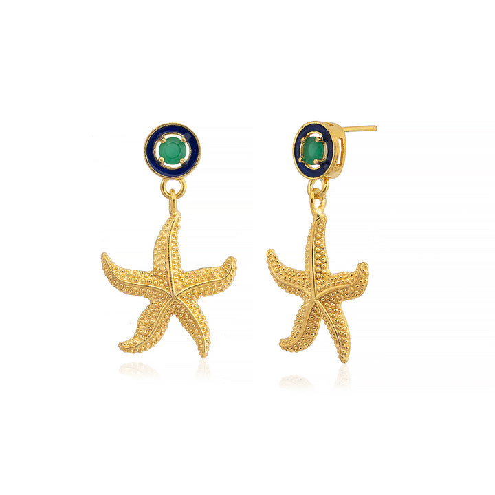 These Starfish Drop Earrings by Milou Jewelry are a beautiful and symbolic accessory. The starfish is a celestial symbol representing infinite divine love, guidance, and brilliance. Handcrafted with 22K gold-plated brass and set with enamel and zircon stones, these earrings are a perfect blend of meaningful design and sophisticated style. They are a graceful reminder of intuition and inspiration, perfect for adding a touch of elegance and personal significance to your look.