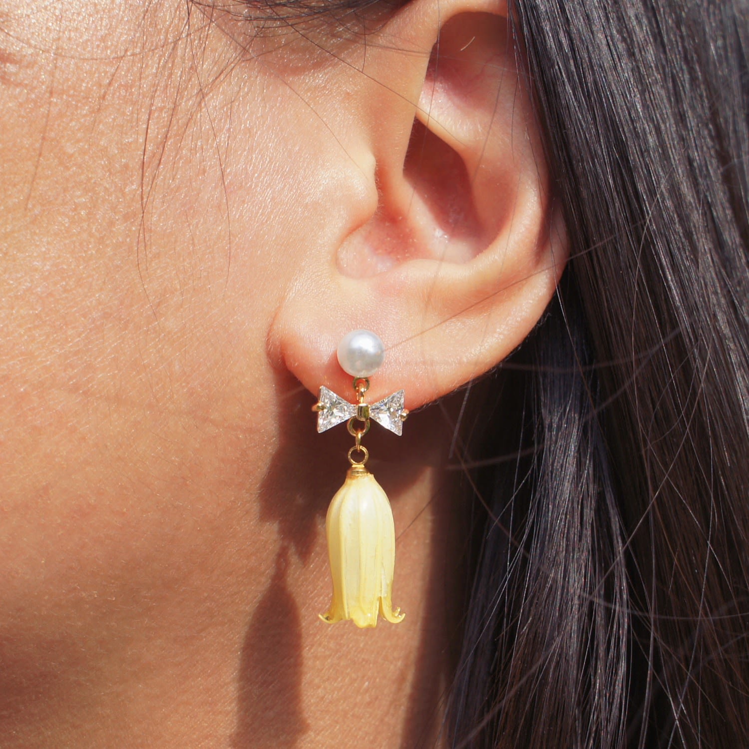 Real Flower Lilian Lily Of The Valley Crystal Bow Flower Drop Pearl Earrings - Butter Yellow