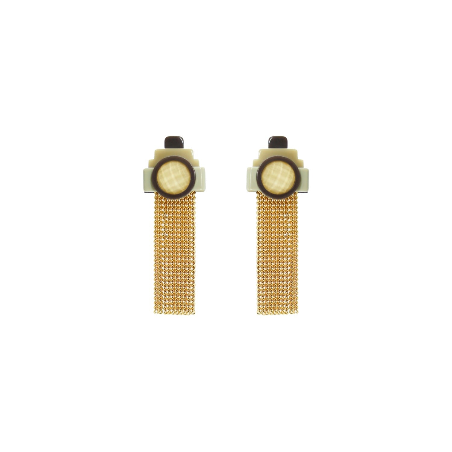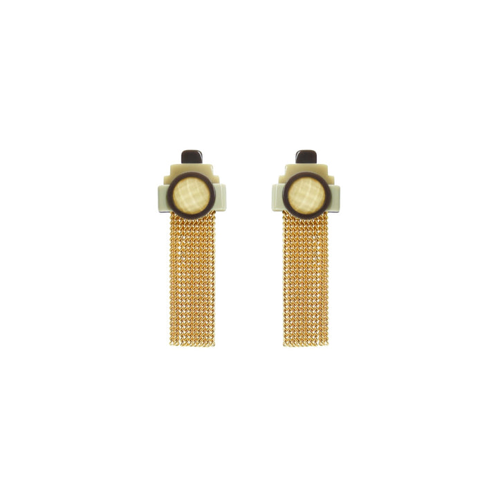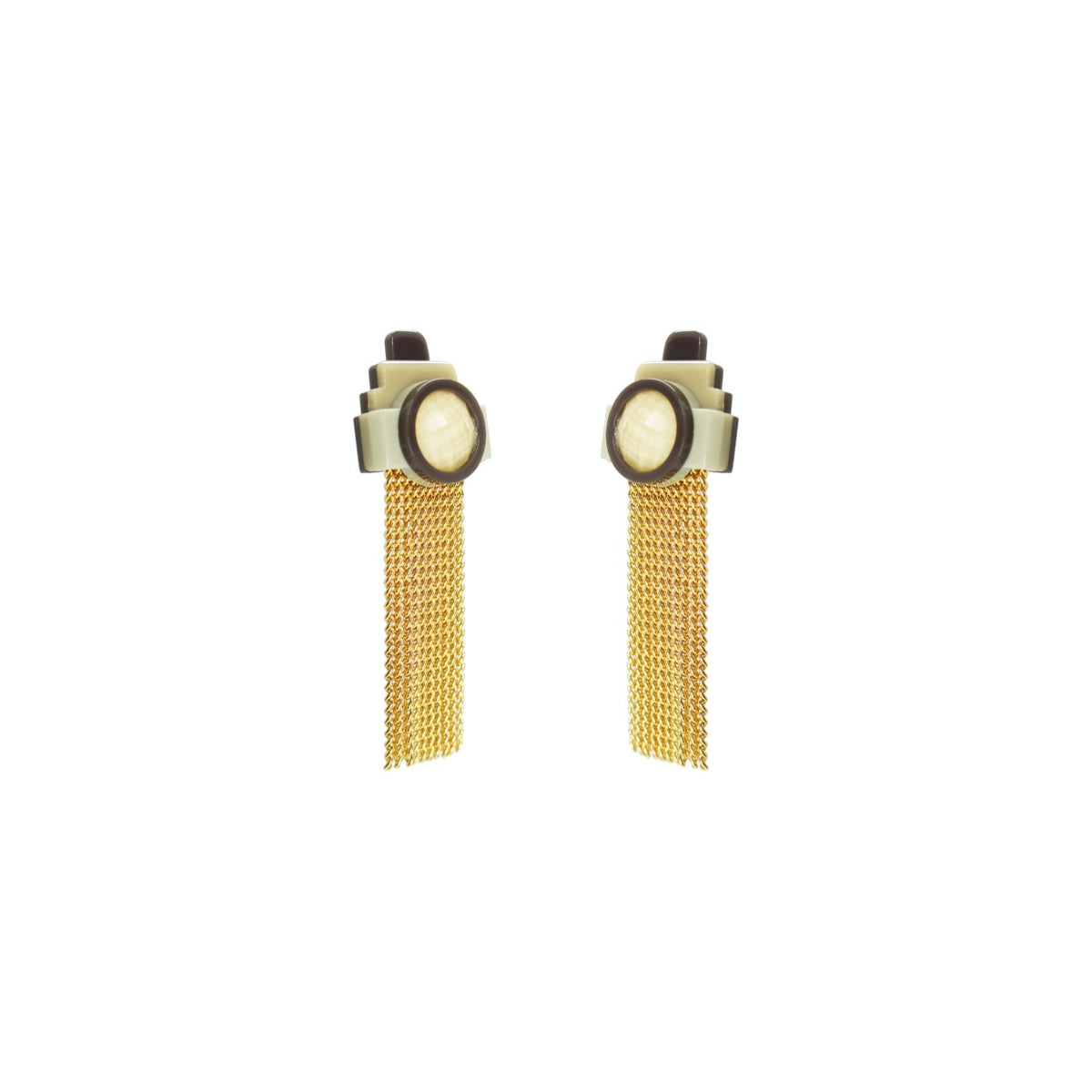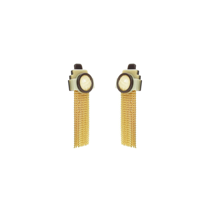 Handcrafted in Brazil, these earrings are made with acrylic, a glass stone, golden-finished brass chain fringe, and a stainless steel pin.
