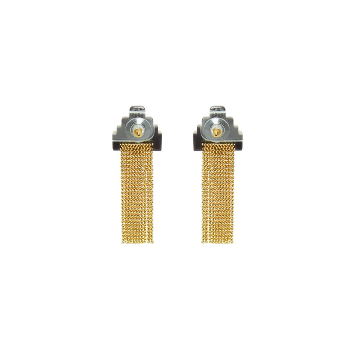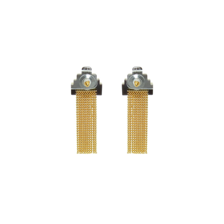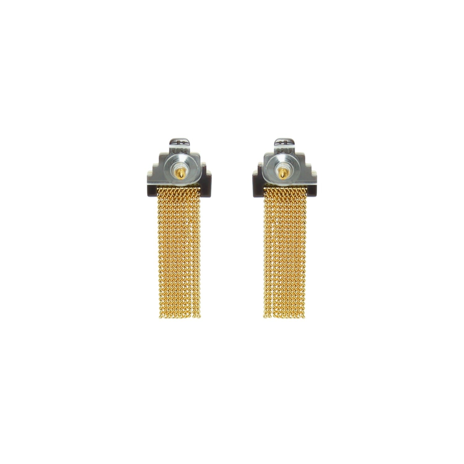 Handcrafted in Brazil, these earrings are made with acrylic, a glass stone, golden-finished brass chain fringe, and a stainless steel pin.