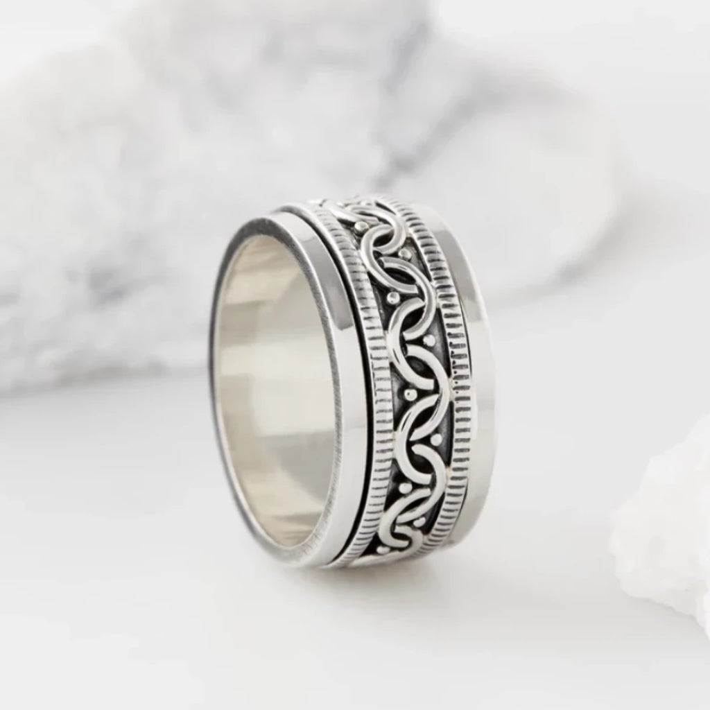 Handcrafted in solid sterling silver. Features intricately carved Celtic knot pattern with spinning mechanism.