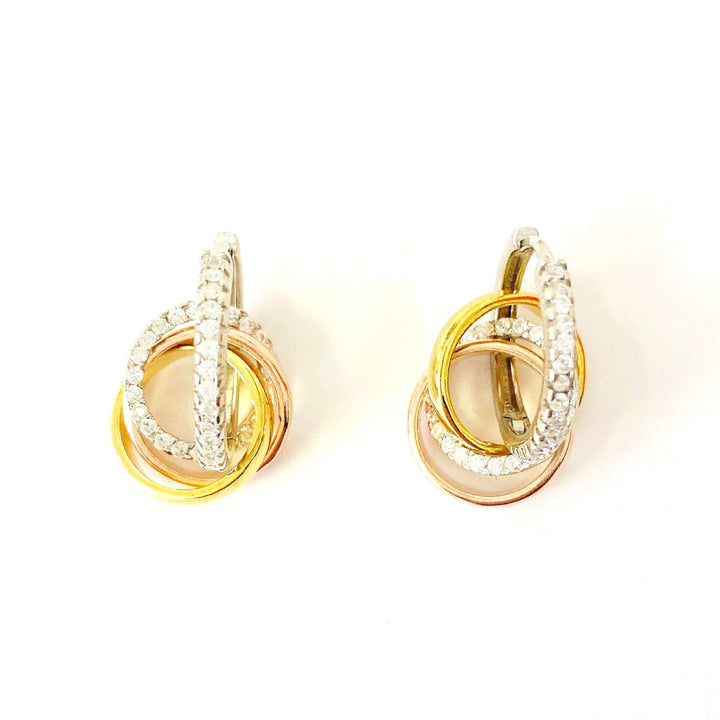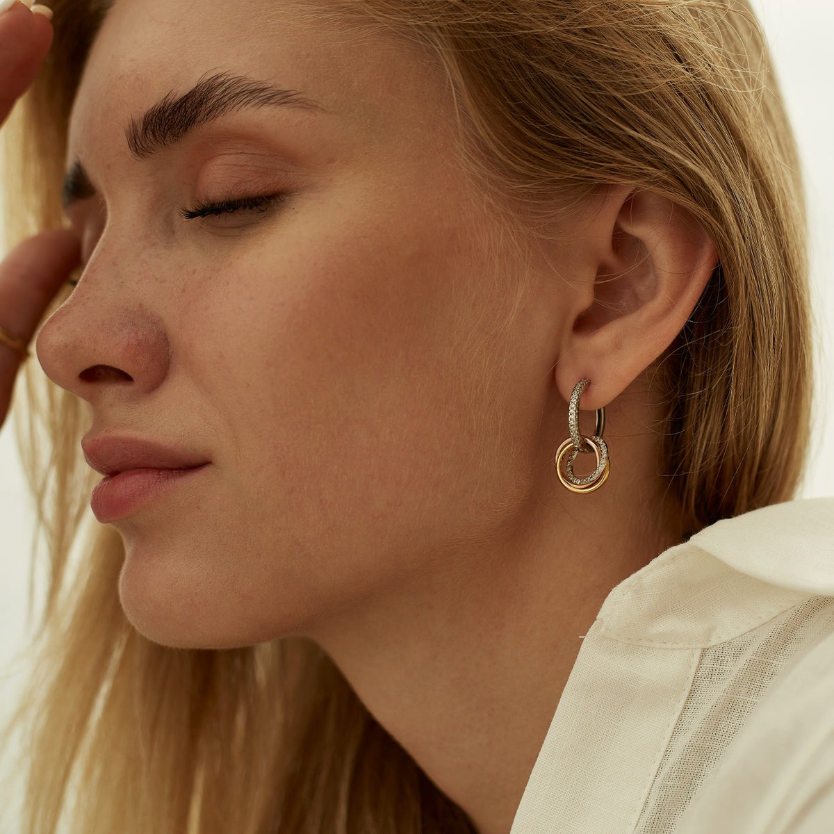 These hoop earrings are made from recycled 925 sterling silver with gold and silver tones. They are paved with cubic zirconia and feature a hinged-back lock for secure wear.