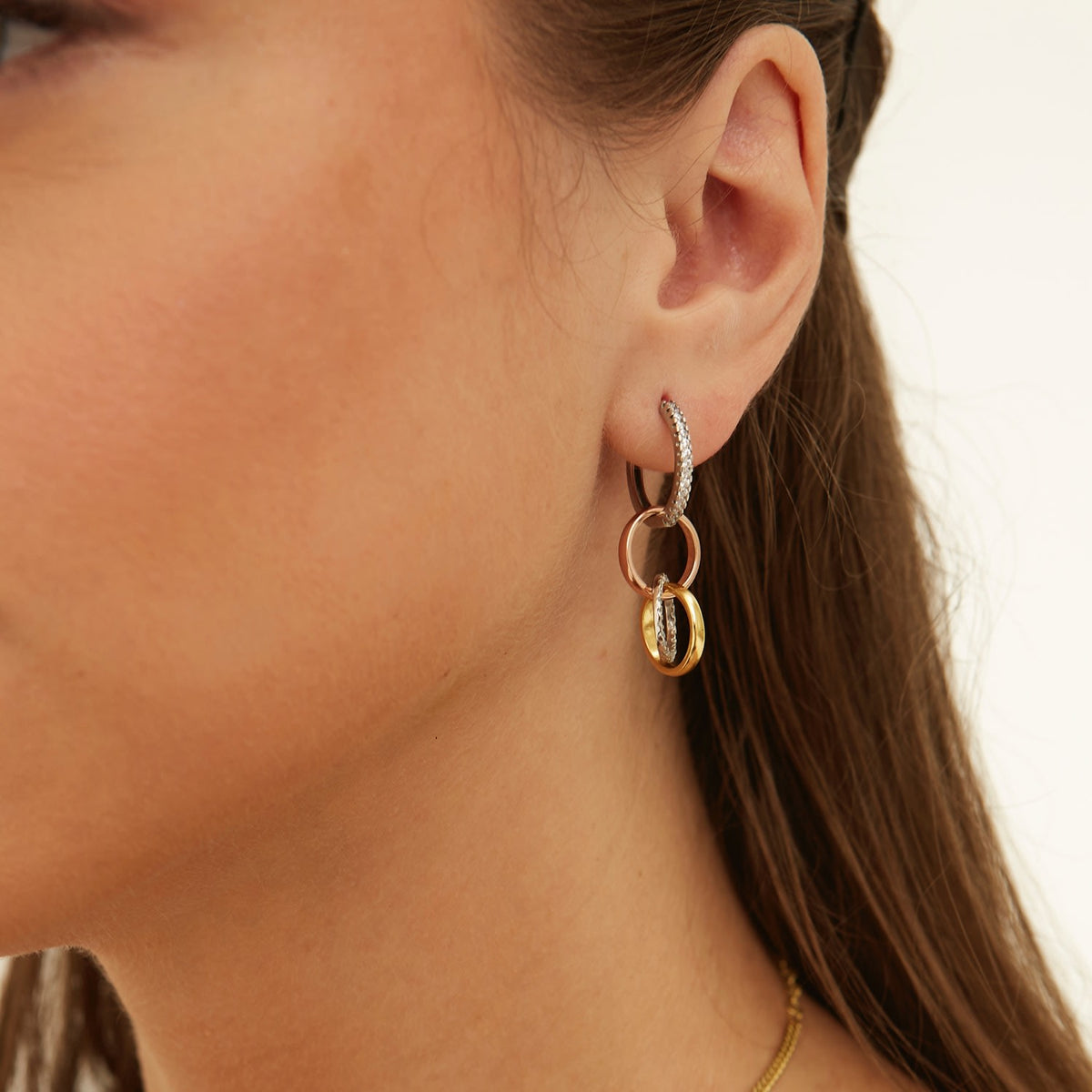 These Fancy Cubic Zirconia Hoops Earrings by Spero London are designed to create a "double impact" wherever you go. Fashioned from recycled sterling silver, the hoops feature a mix of gold and silver tones and are paved with glittering cubic zirconia. The polished, lustrous circles create a trendy and sophisticated look that beautifully accentuates your day-to-night ensembles. These earrings are perfect for someone with an eclectic personality who loves to mix and match with other statement pieces. They symbolize a confident and glamorous style that’s always ready for a party.