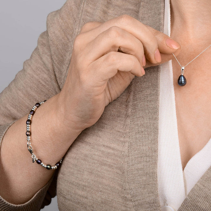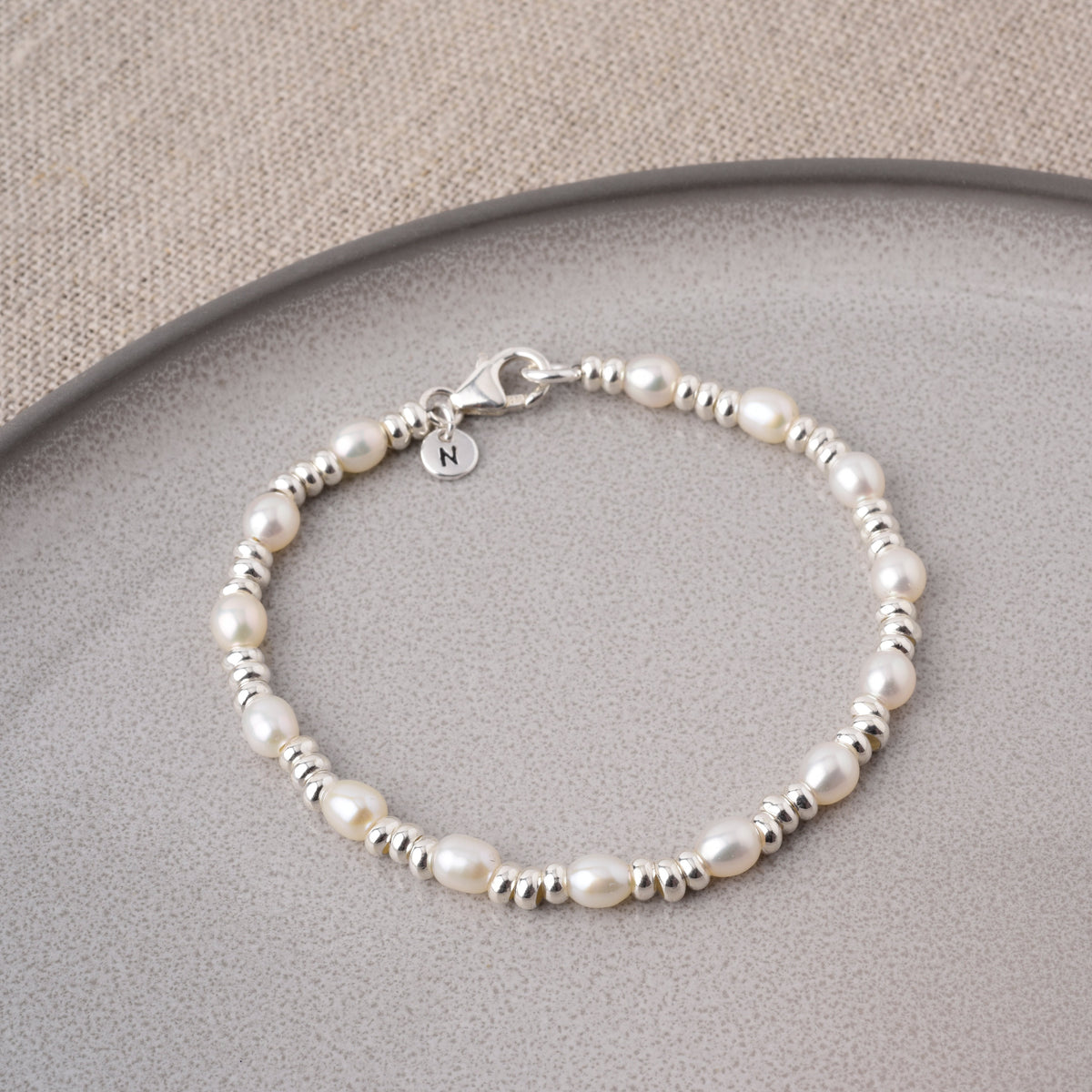 This bracelet is made with freshwater pearls and eco sterling silver beads. It is also available with 18ct gold-plated sterling silver beads.