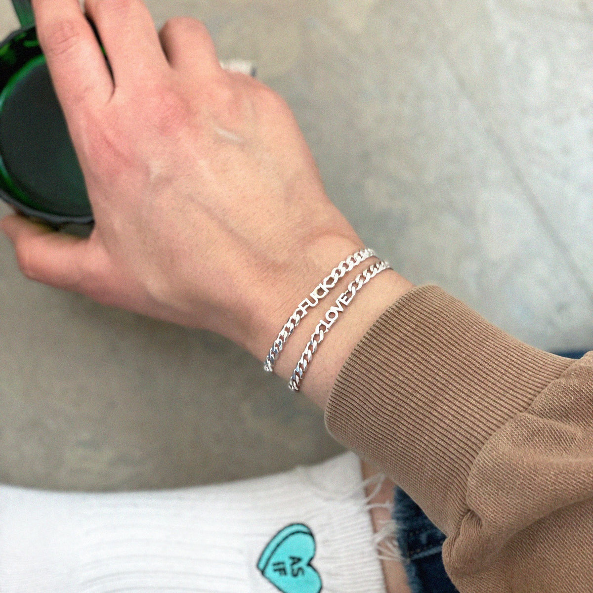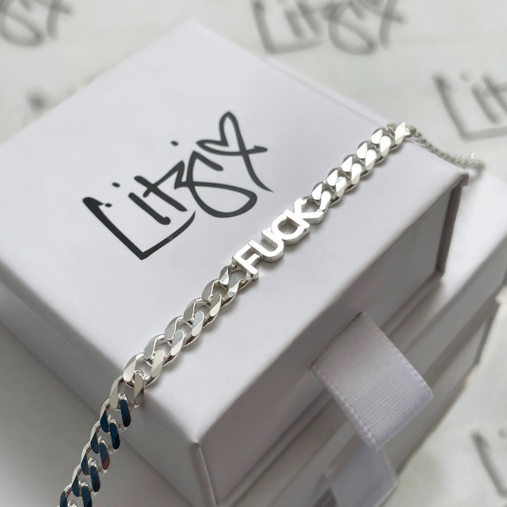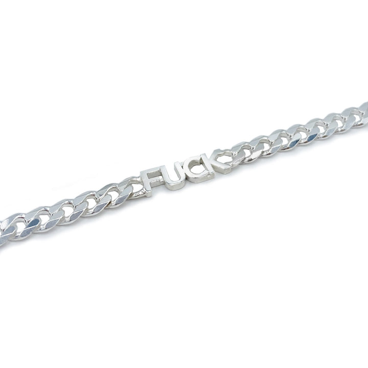 This bracelet is available in sterling silver and features the word "FUCK." It is made in Canada.