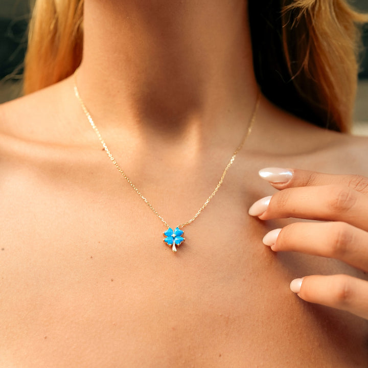 Blue Opal Four Leaf Clover Sterling Silver Necklace - Gold