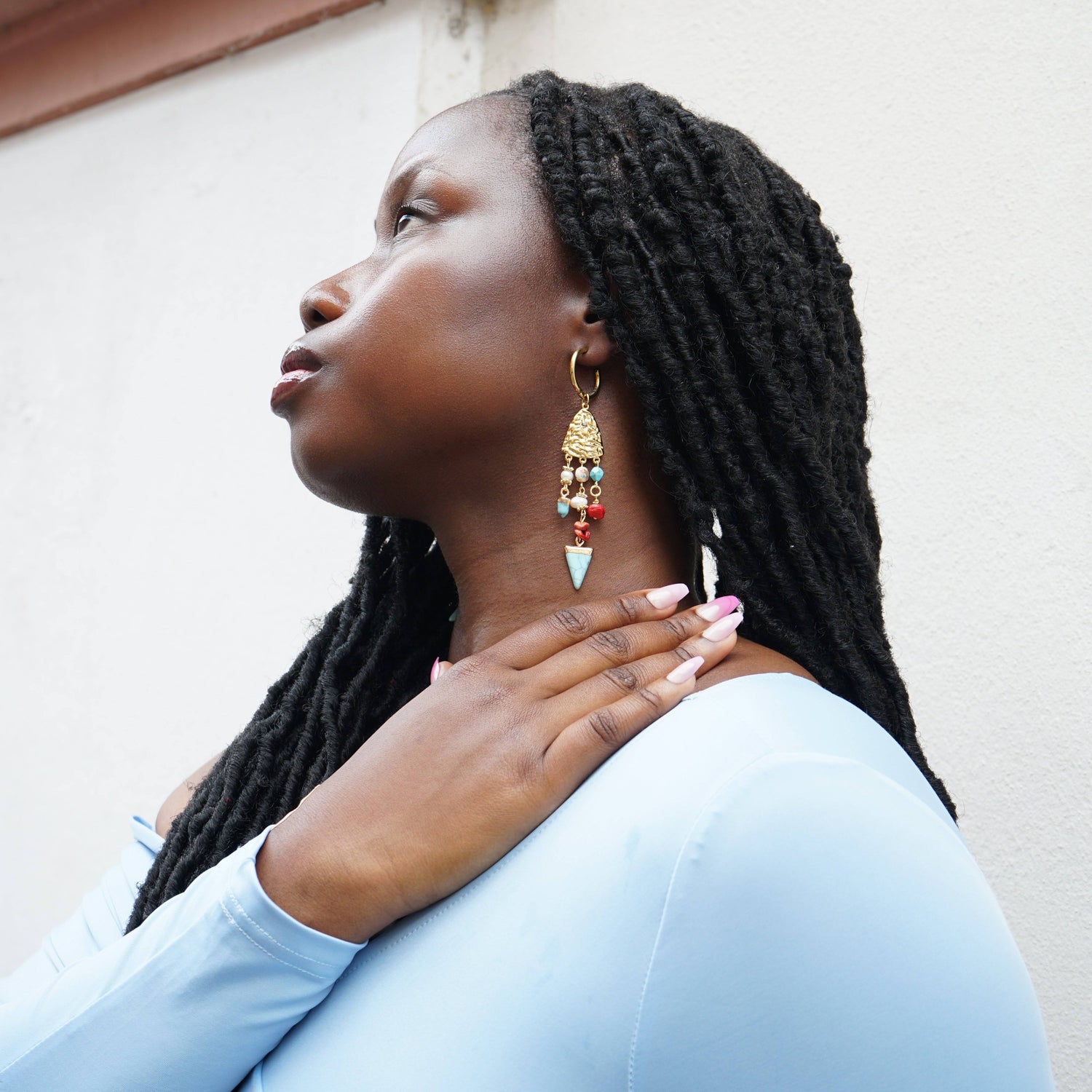 These Gemstone Earrings Phuket by Smilla Brav celebrate the carefree spirit of tropical escapes. Handcrafted with turquoise, red coral, and freshwater pearls, each strand dances with movement and color. Paired with textured gold-plated elements, they embody playful boho-chic style. Each pair is unique, made from upcycled and ethically sourced beads, carrying both beauty and sustainable values.