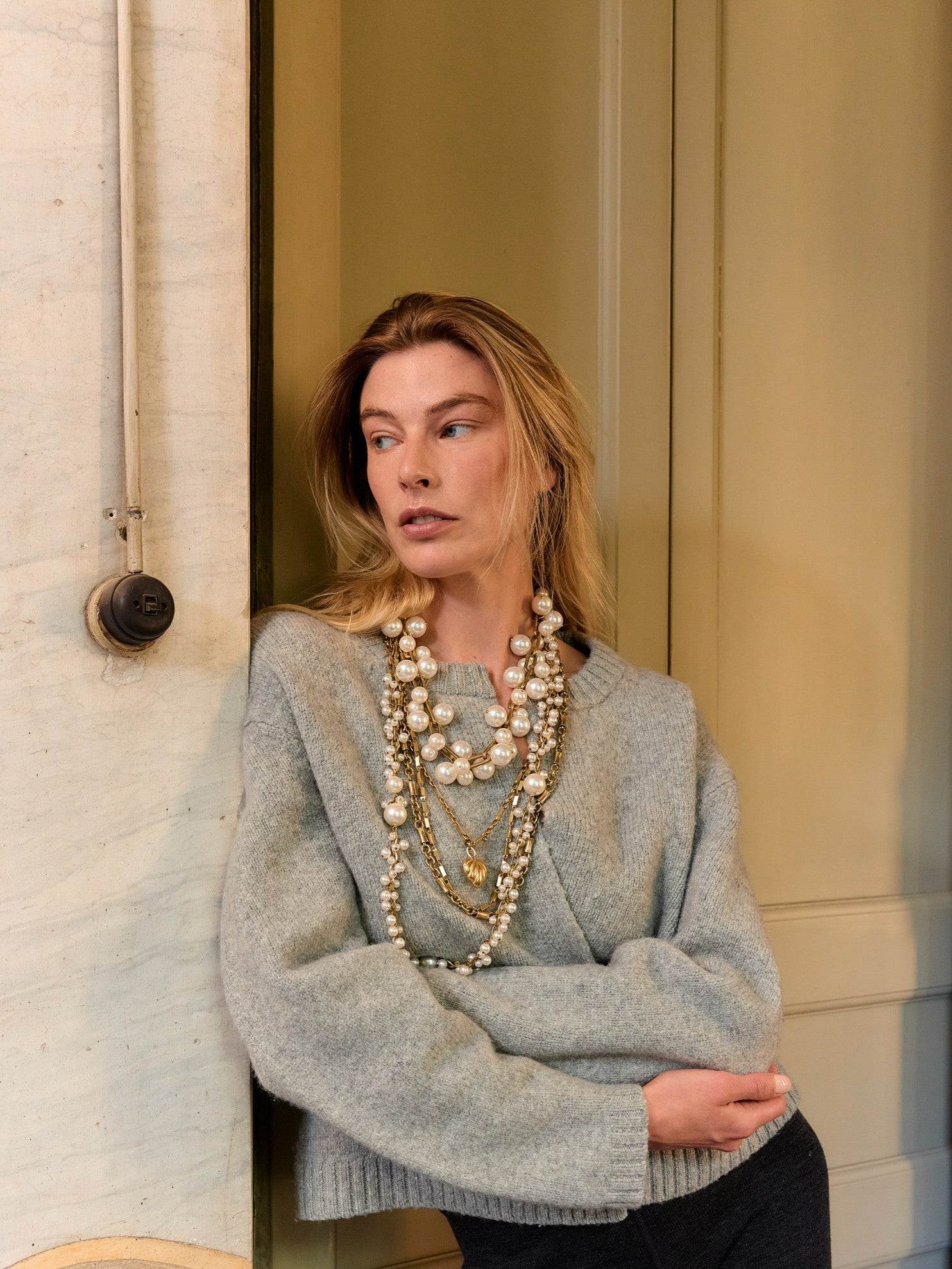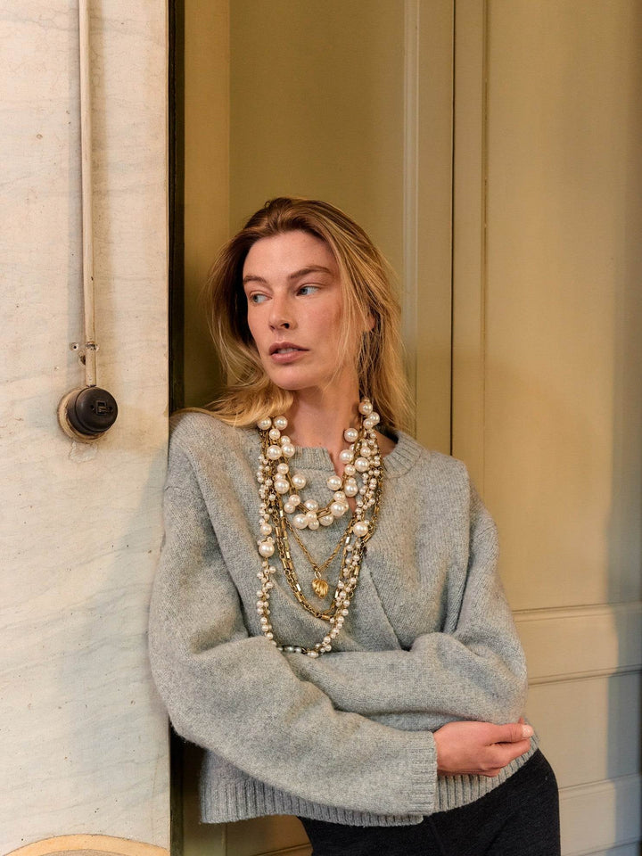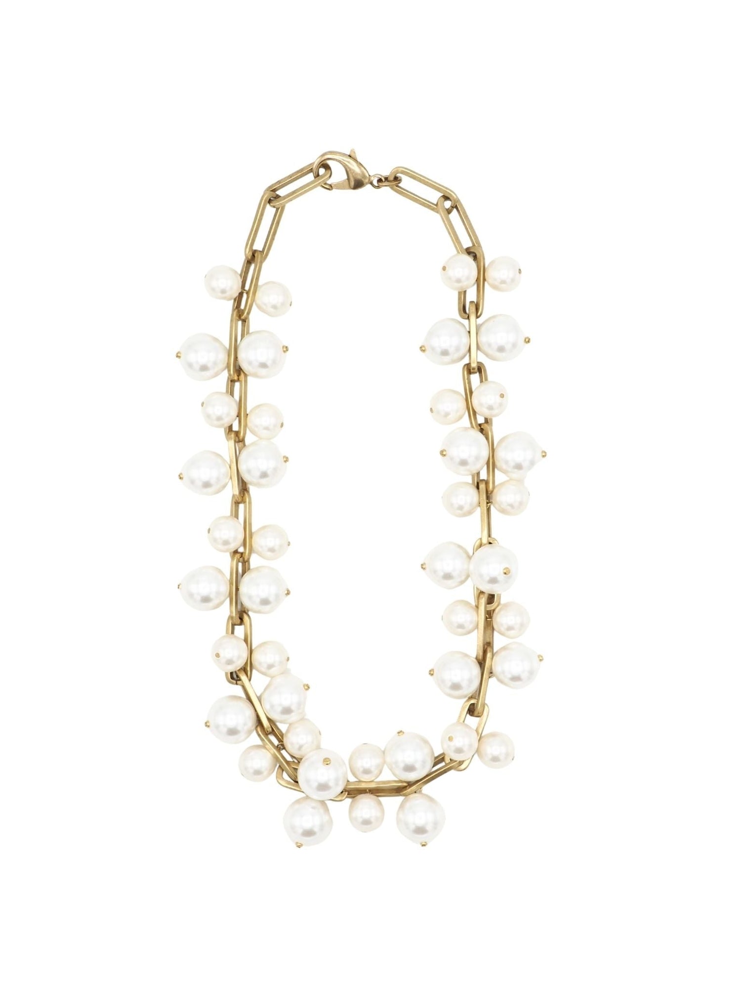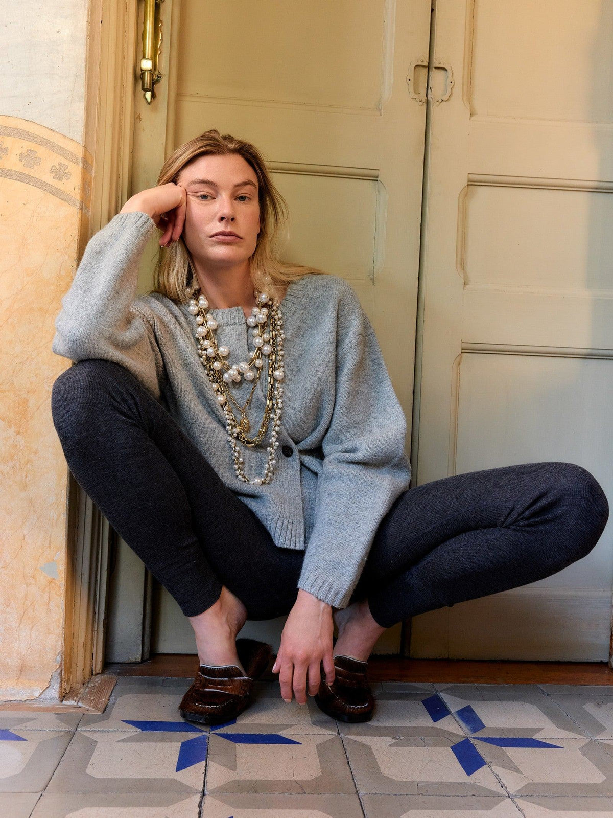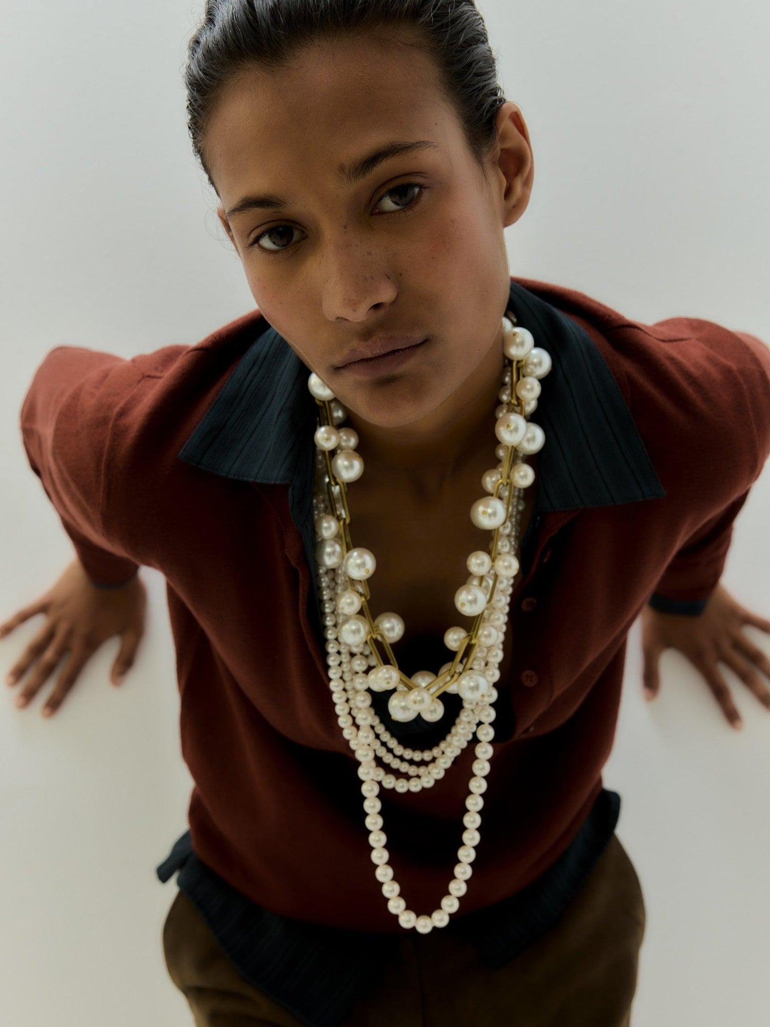 This Las Bodas Necklace by Sita Nevado is a striking statement piece designed to rest elegantly at the mid-chest. Crafted with a chain of large, oval brass rings and interspersed with natural stone beads, this necklace creates a bold and beautiful silhouette. The combination of the polished brass and the earthy, natural stones gives it a rustic yet modern feel, perfect for a bohemian-chic look. Its substantial weight and unique design make it a truly eye-catching accessory.