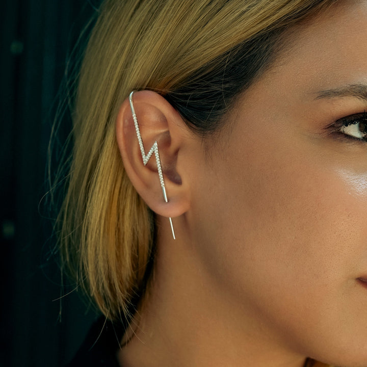 Sterling Silver Lightning Bolt Ear Crawler With Sparkling White Gemstones - Pair - Silver