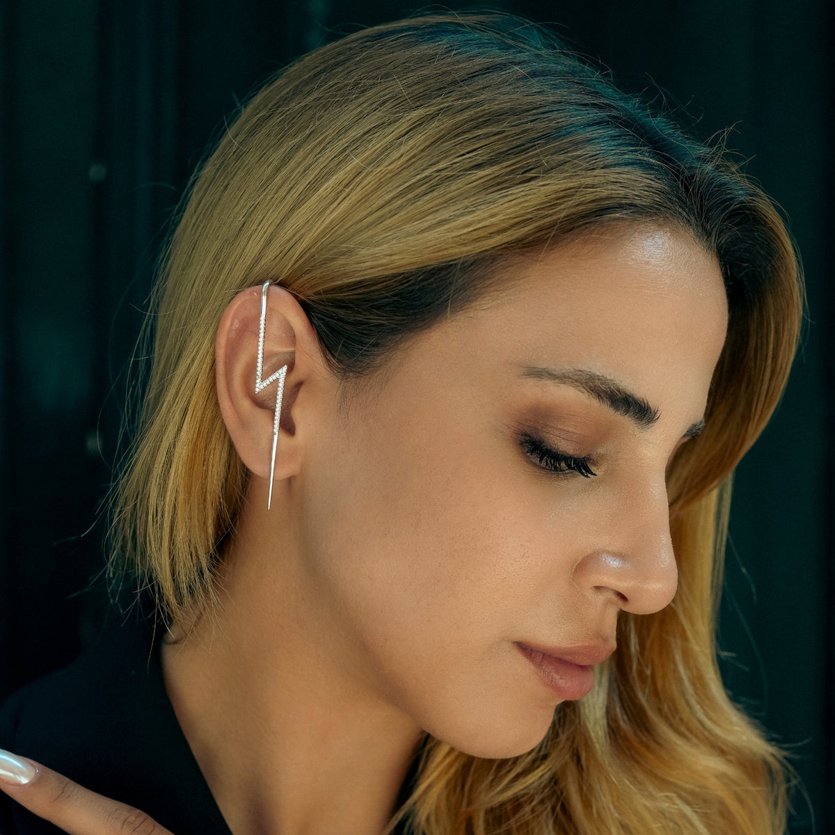 These Sterling Silver Lightning Bolt Ear Crawlers by Spero London radiate a fierce and edgy energy. Sold as a pair, they feature sparkling white gemstones and a lightning bolt design that lights up any outfit. These crawlers add a touch of modern and confident style, symbolizing power and a daring personality. They are the perfect accessory for anyone who wants to make a statement.