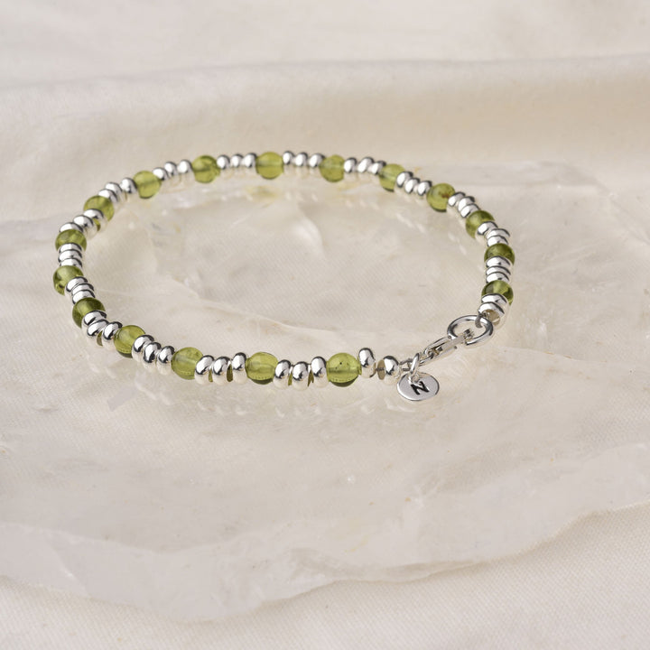 Made from eco sterling silver with natural peridot gemstones. Beaded design with secure bracelet clasp.