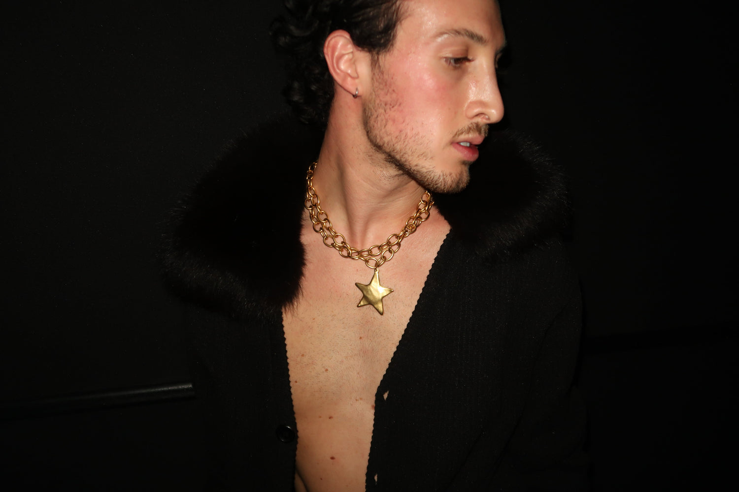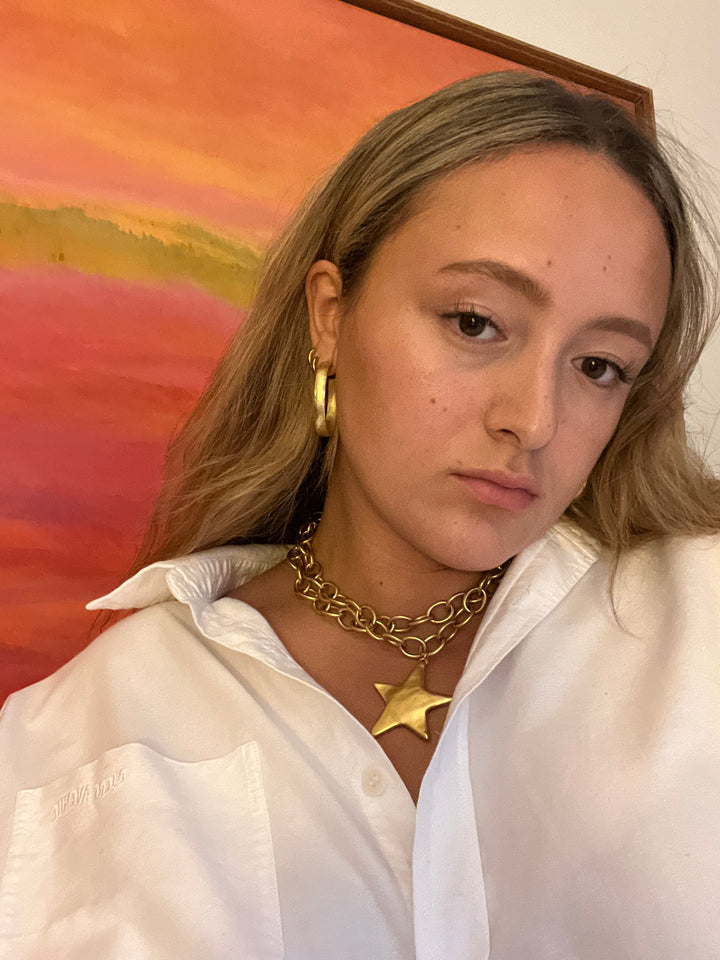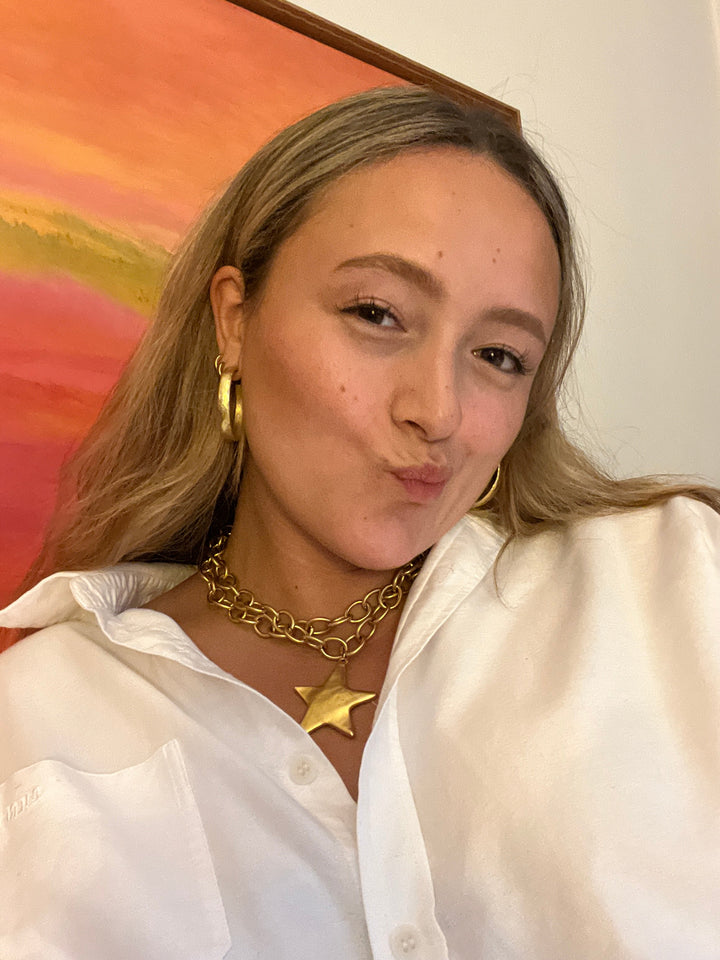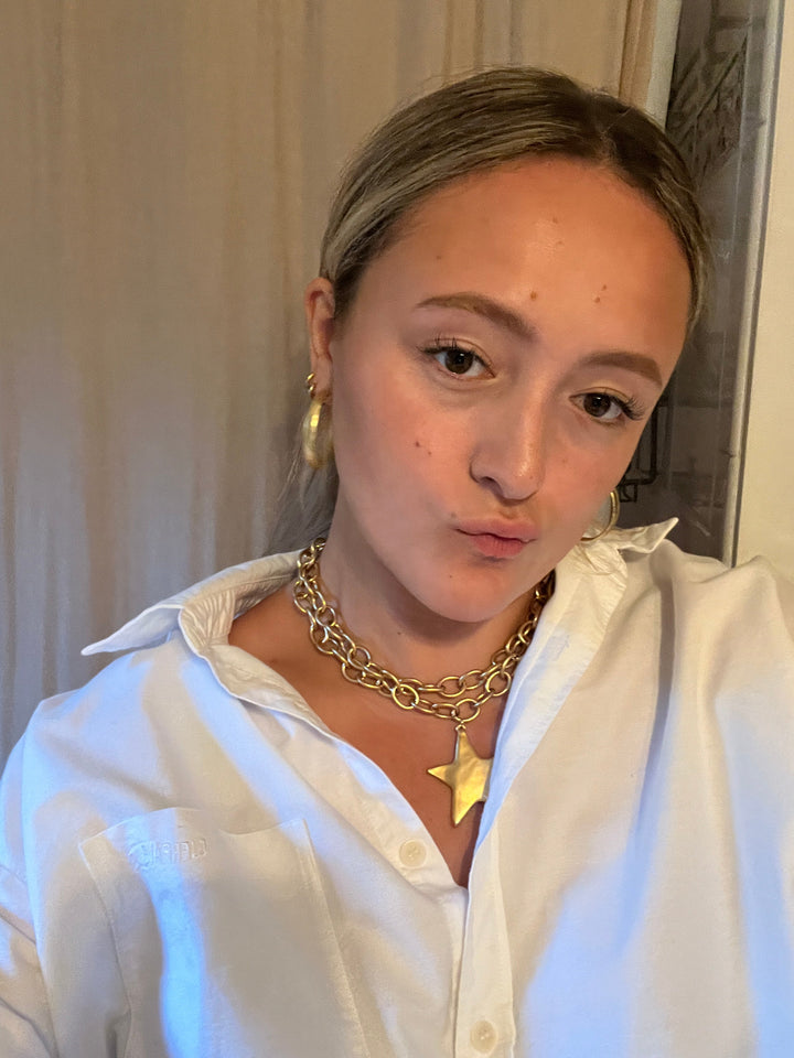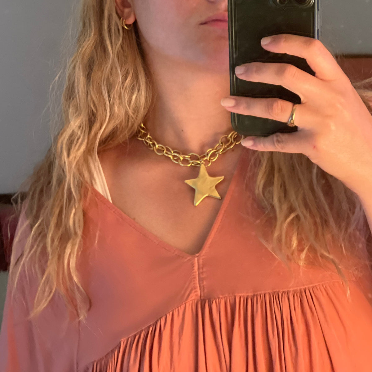 This Gia Gold Star Necklace by Sccollection is a necklace for a true star. The asymmetrical, double-layered chunky chain features a hand-carved star pendant and is finished with an oversized toggle clasp. This necklace is a bold and powerful statement, perfect for a star who wants to shine.