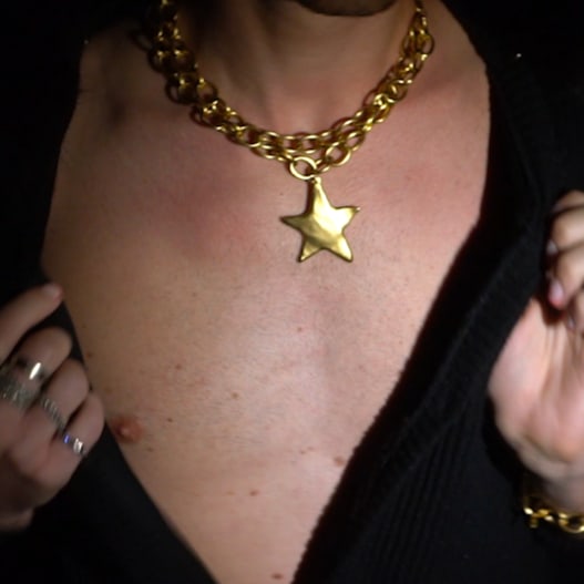 This necklace is crafted from a 12k antiqued gold-plated steel oval chain and a 12k antiqued gold-plated brass rectangle multi-link chain. It has a hand-carved 12k antiqued gold-plated pewter star pendant and an oversized 12k antiqued gold-plated pewter toggle clasp. It measures 17.5 inches.