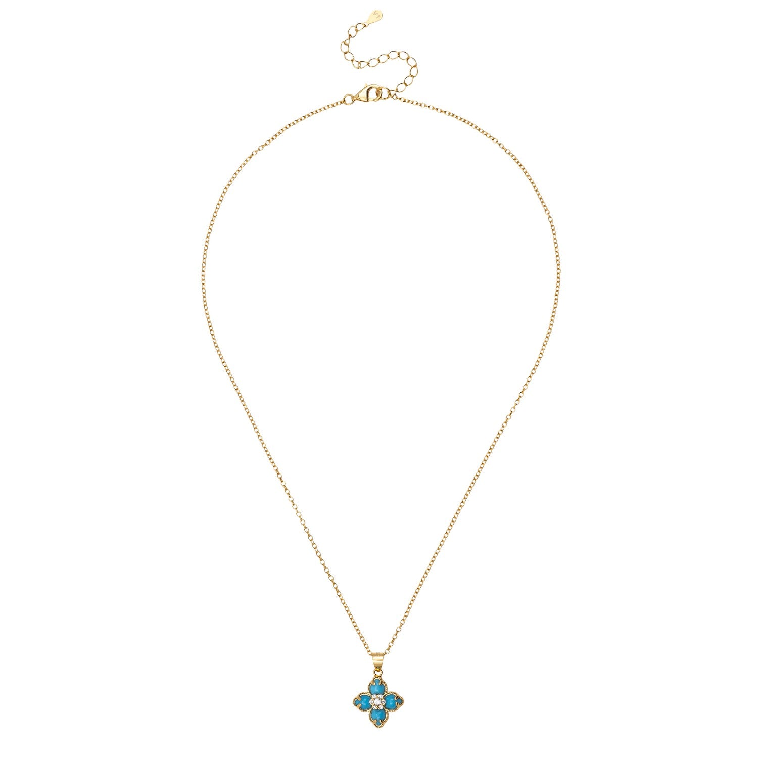 This necklace is handcrafted from 925 sterling silver and is dipped in 18ct gold. It features an inlaid turquoise and a cubic zirconia center.