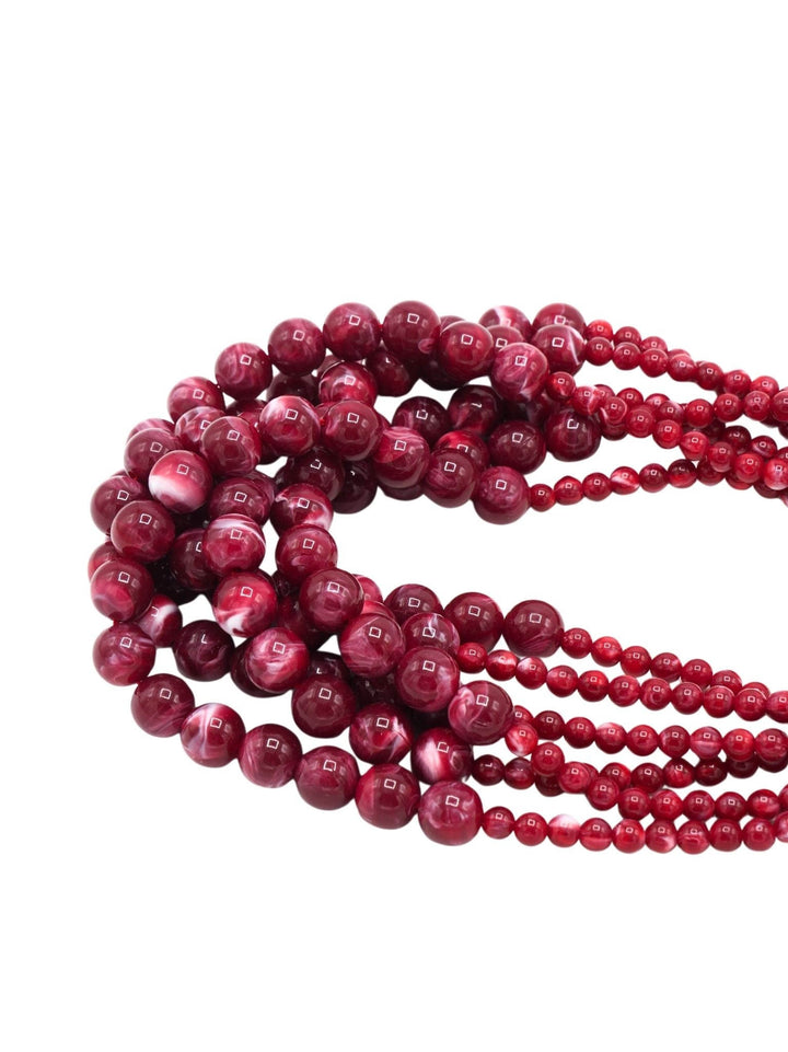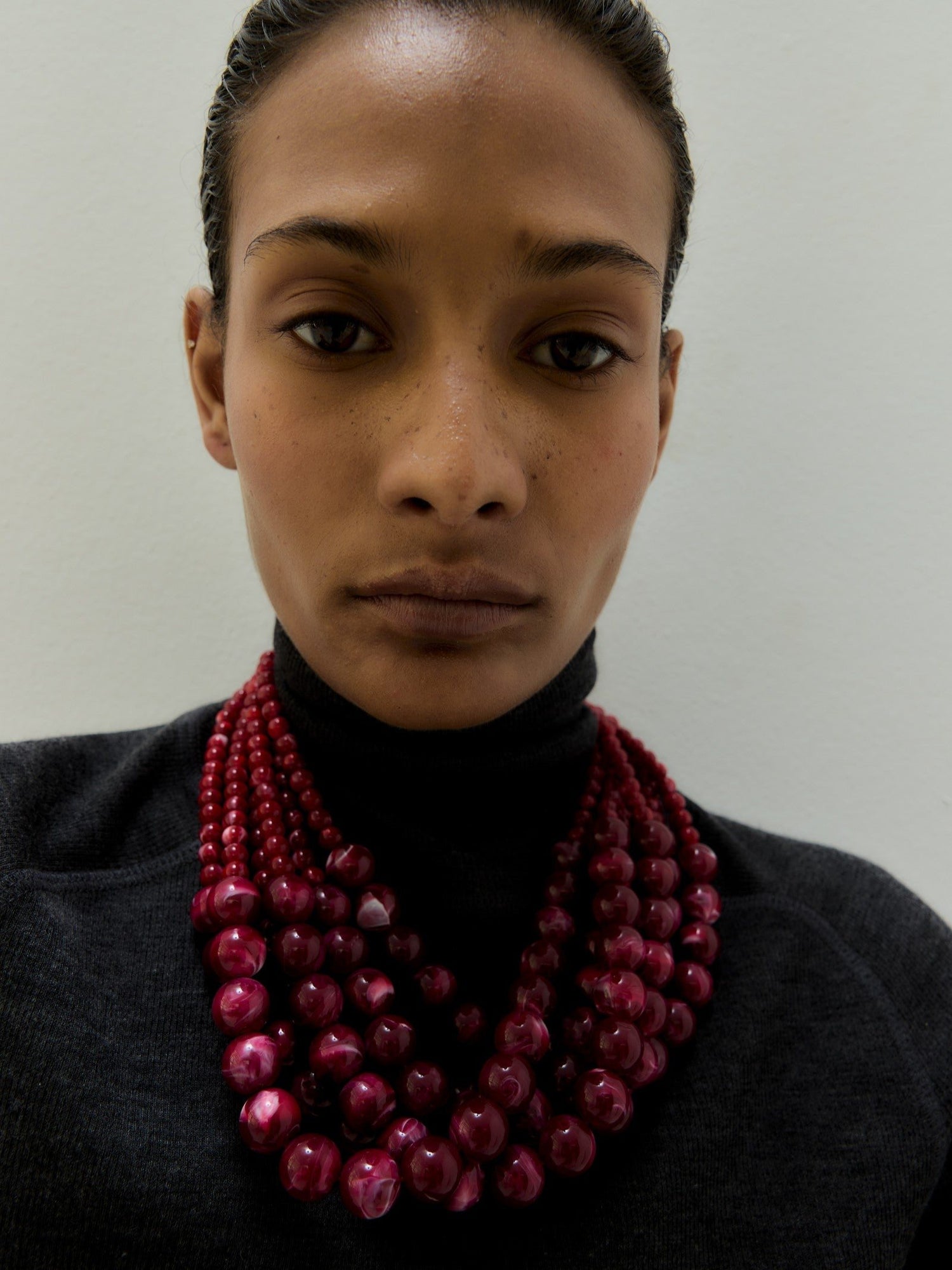 This Louise Necklace - Dark Red by Sita Nevado is a bold and dramatic accessory. The short, multi-strand design is made with six equal strands of large and small resin balls in a unique bicolor effect. The necklace has a length of 55cm with a 6cm extension and a substantial weight of 280g, making it a true statement piece that commands attention. Its artistic and sophisticated look makes it a perfect accessory to add a vibrant pop of color and style to any outfit.