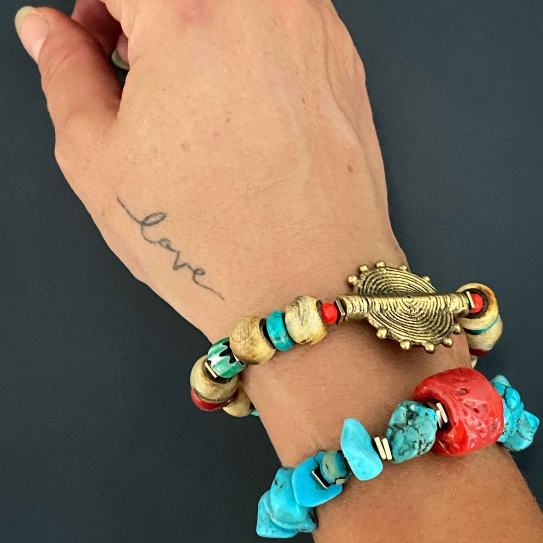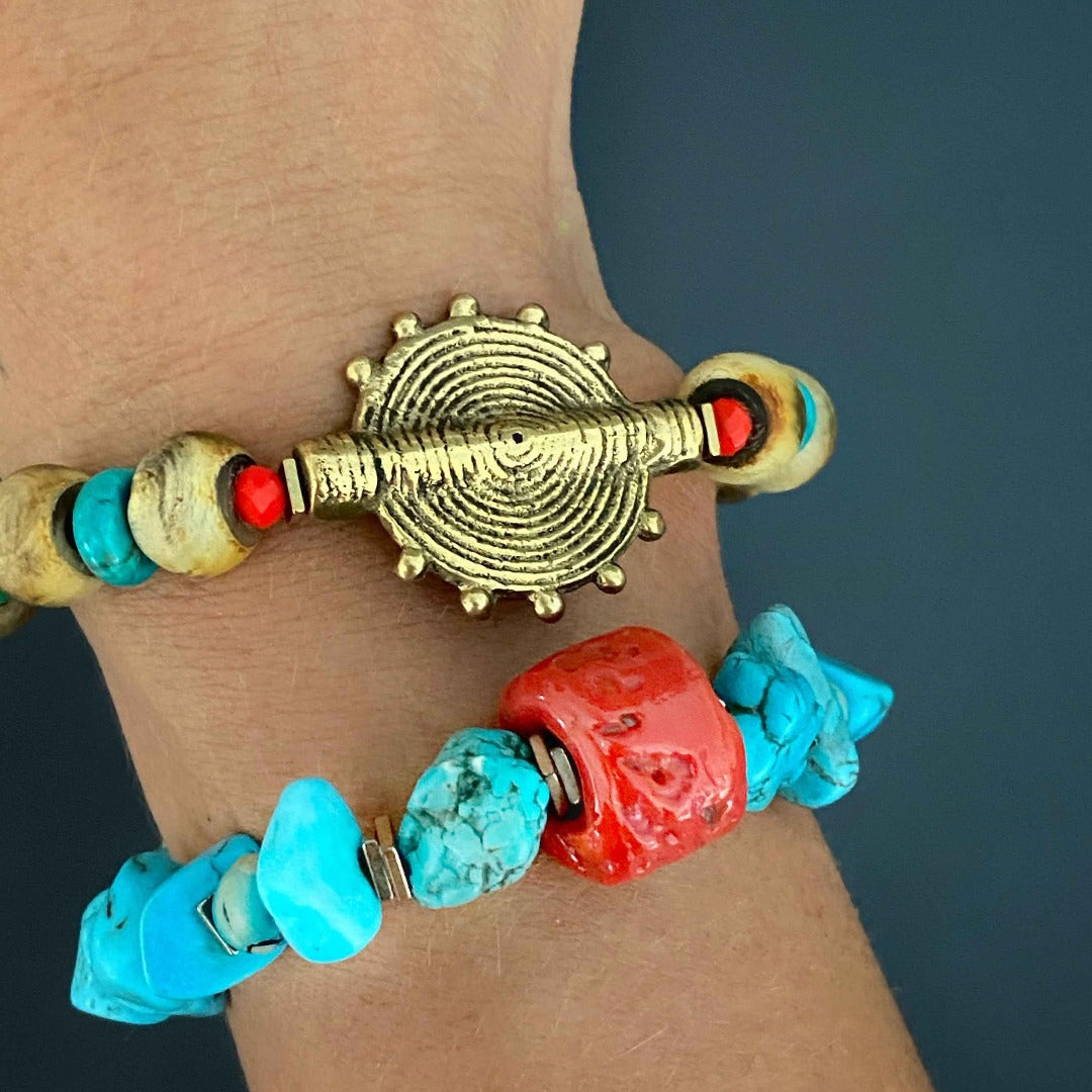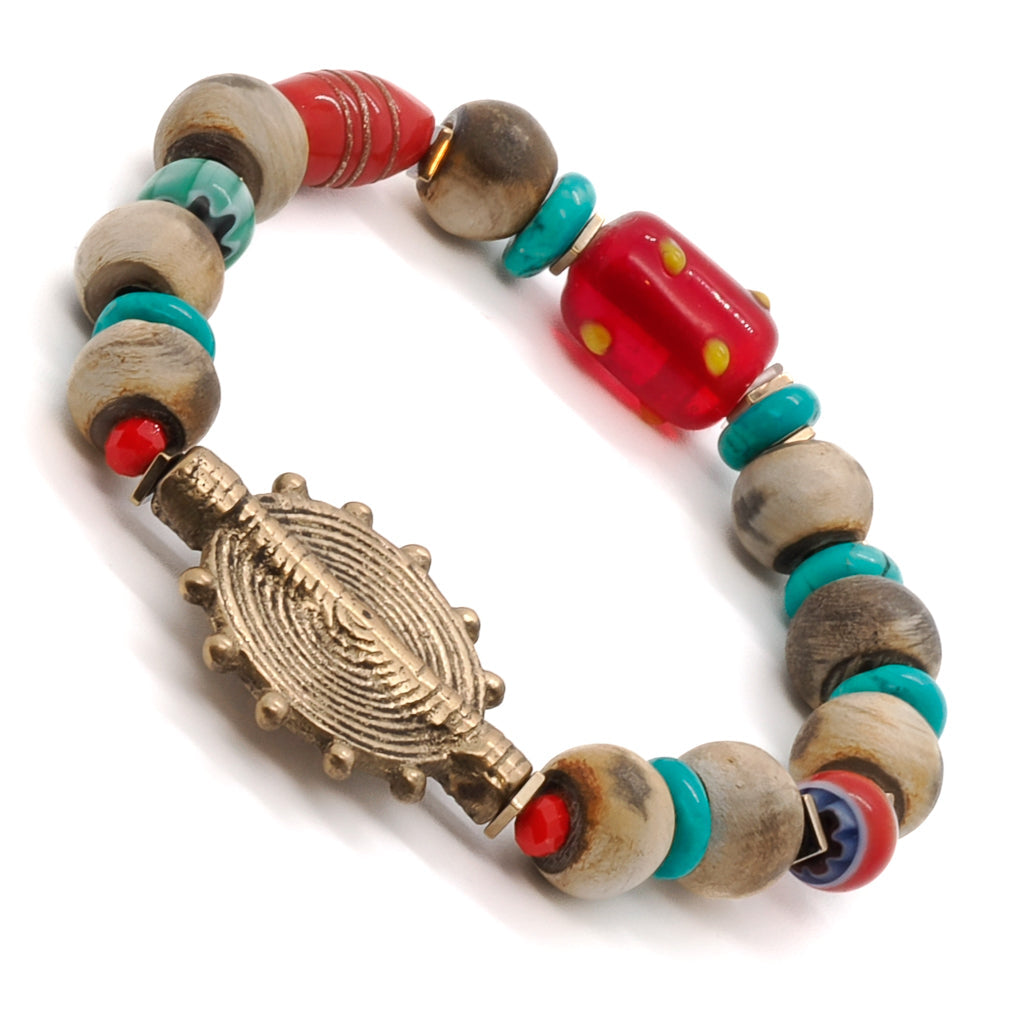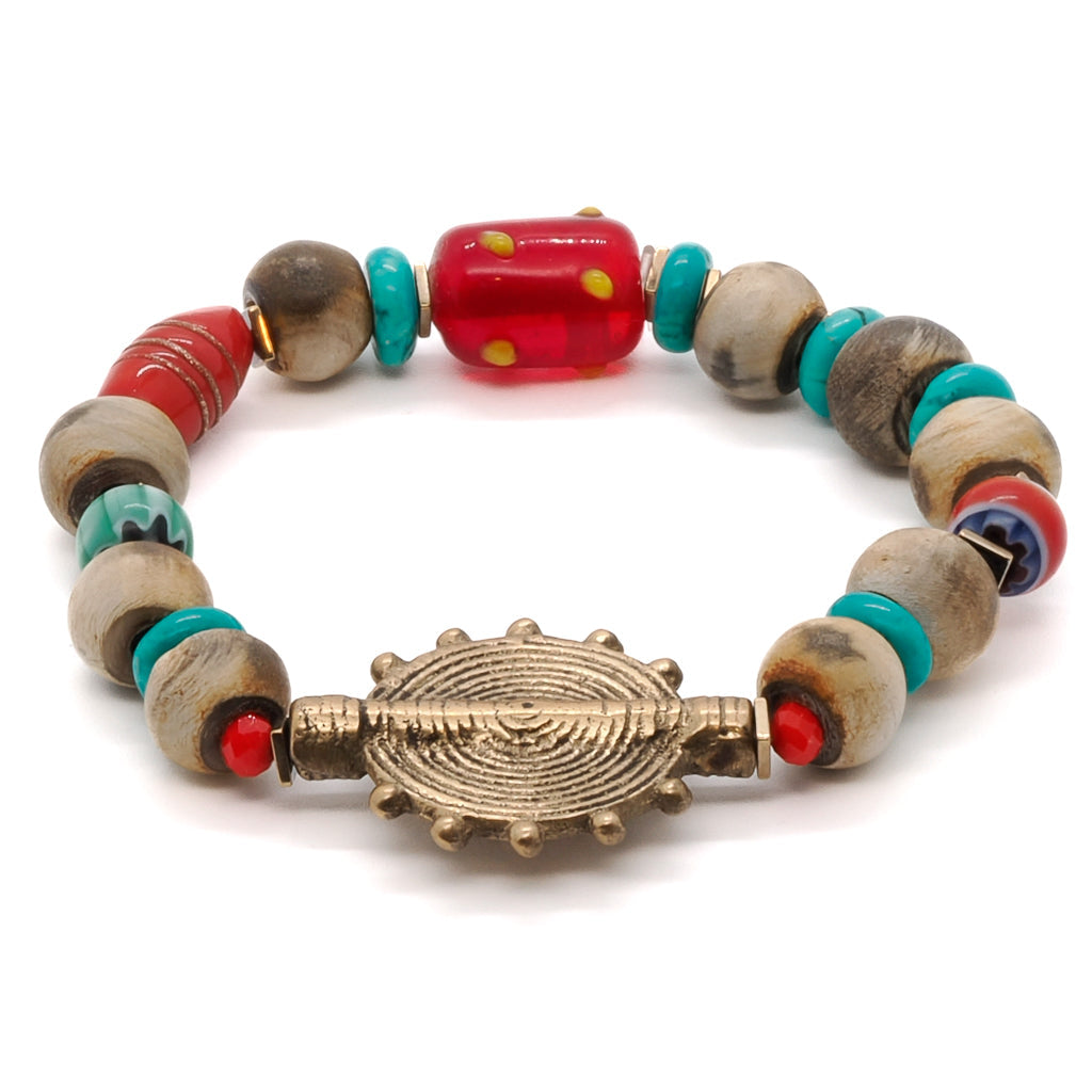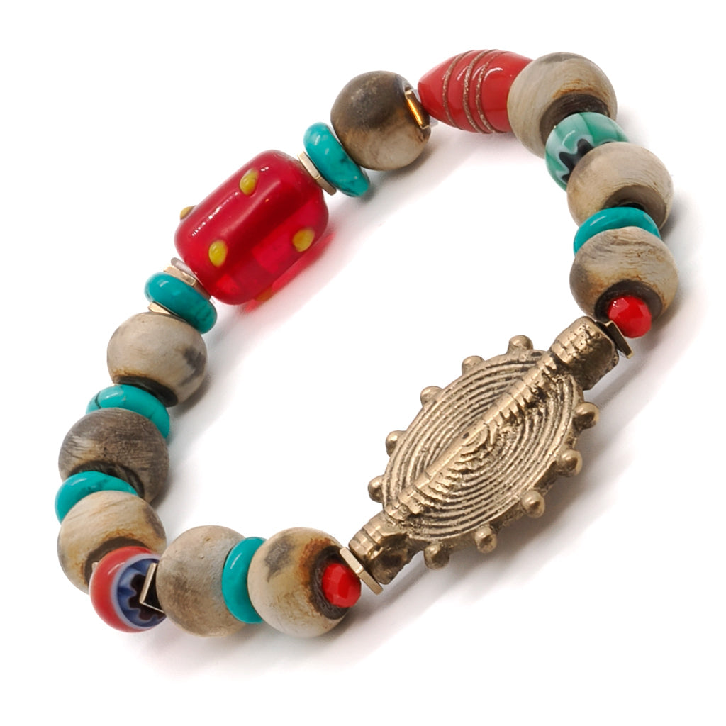 This handmade bracelet is made with Nepal seed beads, Ron dell turquoise beads, tiny orange crystal beads, gold color hematite spacers, a red and yellow Mystic glass bead, and a gold color Tibetan brass Ethnic charm bead. The bracelet size is 6.5 inches.