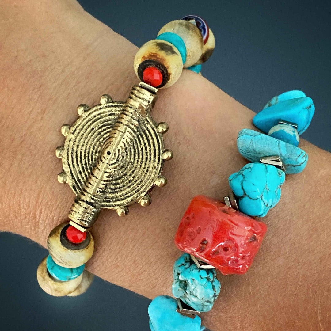 This Tibetan Ethnic Beaded Bracelet by Ebru Jewelry features a captivating combination of elements that create a striking visual appeal. This handmade bracelet includes Nepal seed beads, turquoise stone beads, and a centerpiece with a Tibetan brass ethnic charm bead. The turquoise stone is a popular element in Tibetan jewelry and symbolizes balance and protection. The gold-colored hematite spacers and tiny orange crystal beads add a pop of color to the intricate design.