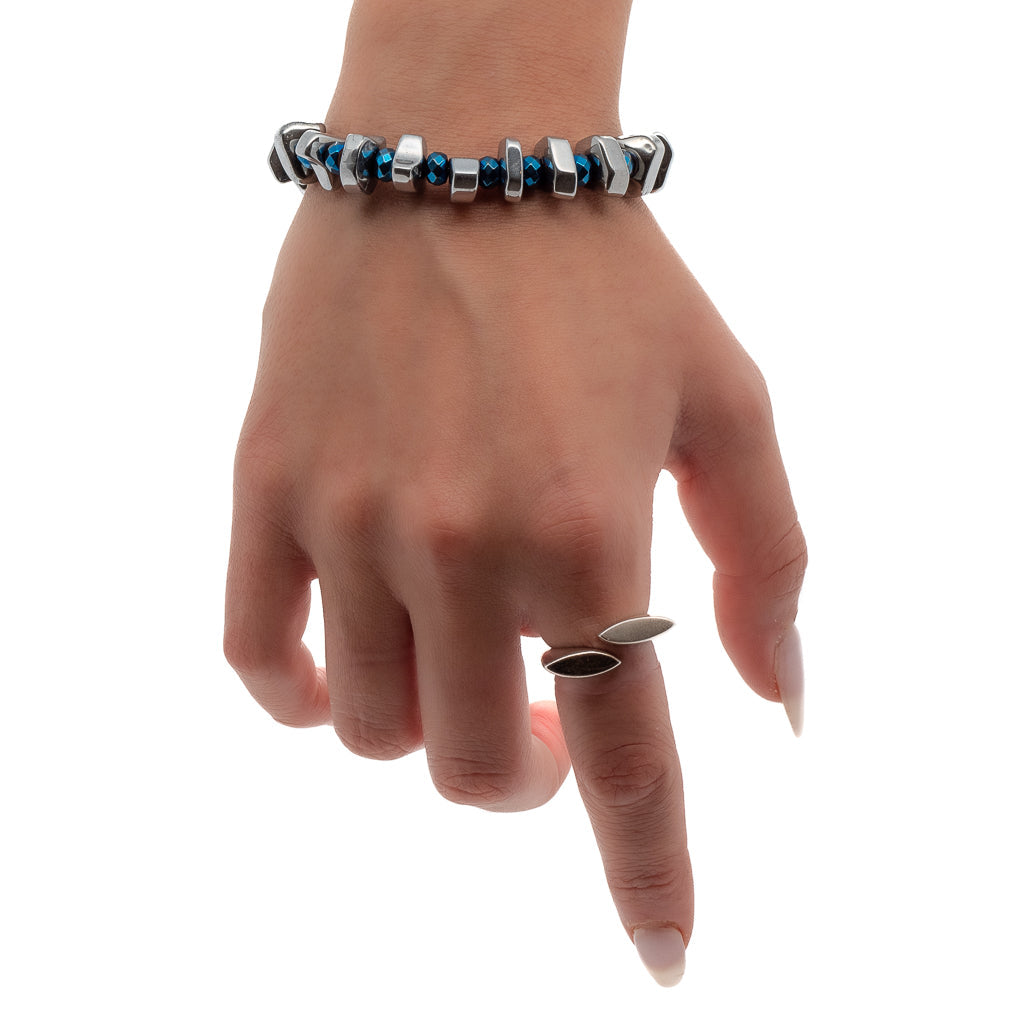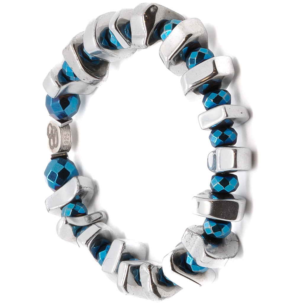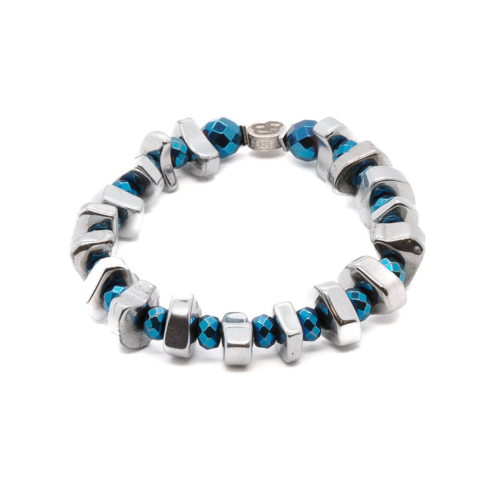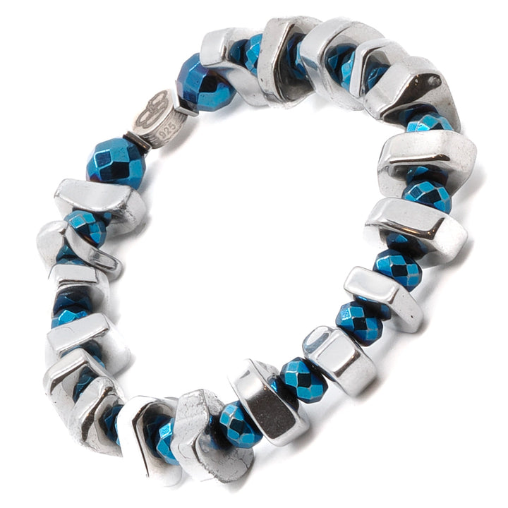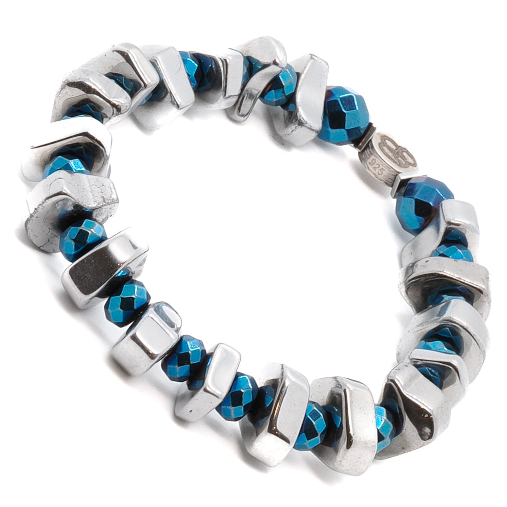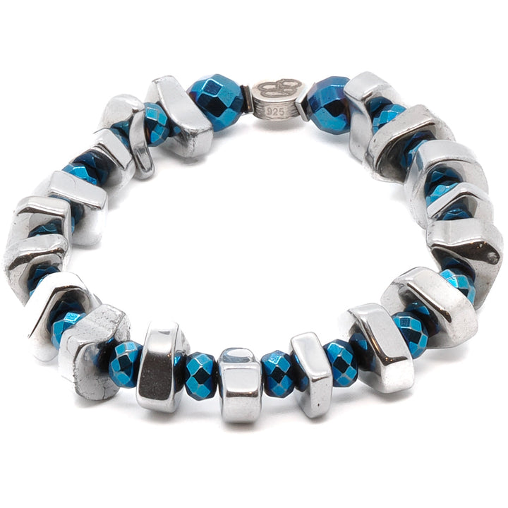 Crafted with silver and blue nugget hematite stone beads. 925 sterling silver logo bead. 6.5" stretch bracelet on high-quality elastic cord.
