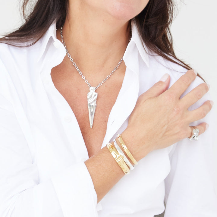 This Fortitude Large Bangle Cuff Bracelet - Gold by Nicole Amato is a chic and powerful accessory that can be worn alone or stacked with a smaller cuff. The cuff bangle features carved edges that reflect light and shine as you move. Crafted from gold-plated brass, it's a bold and luxurious piece that adds a touch of glamour to your day.